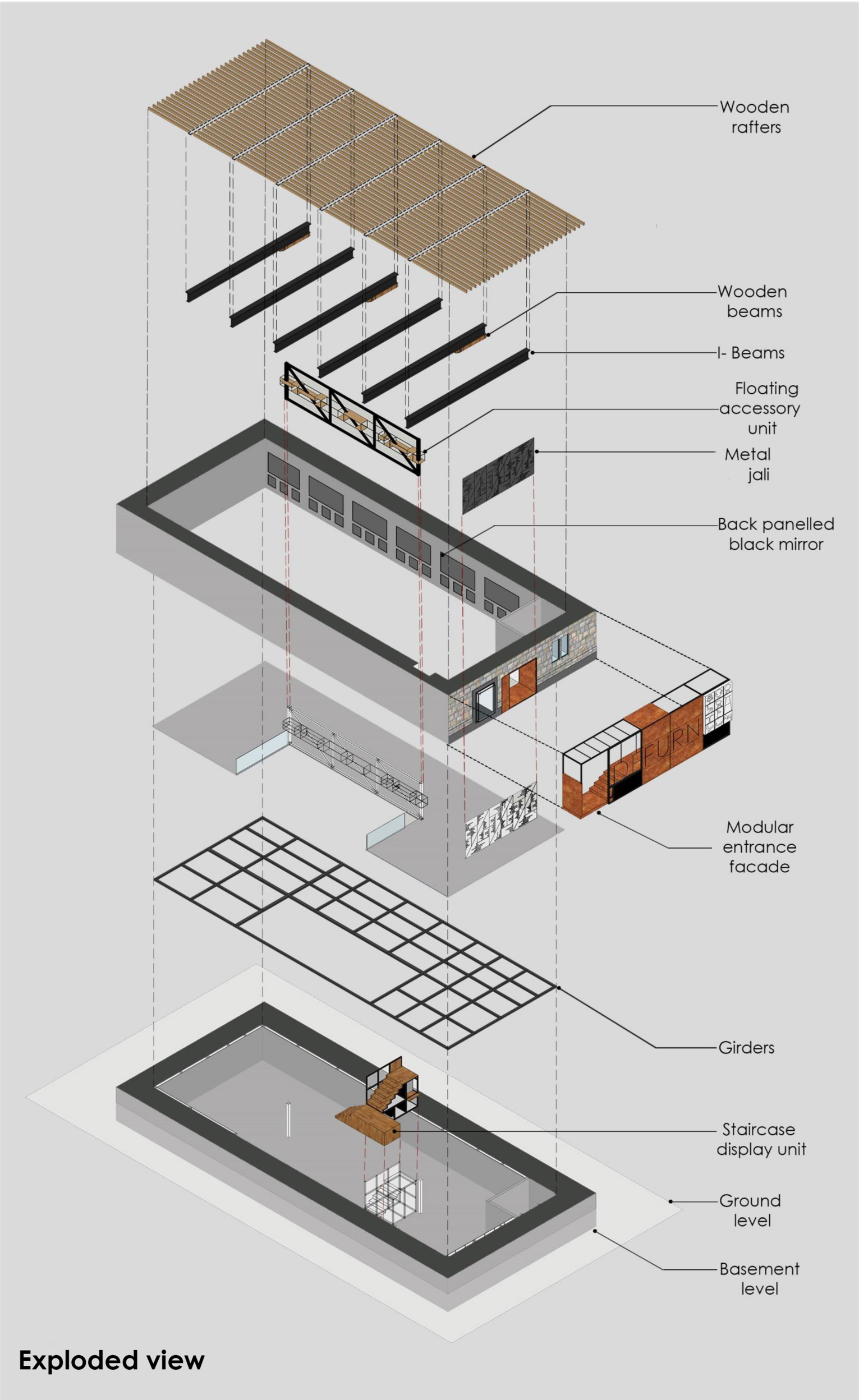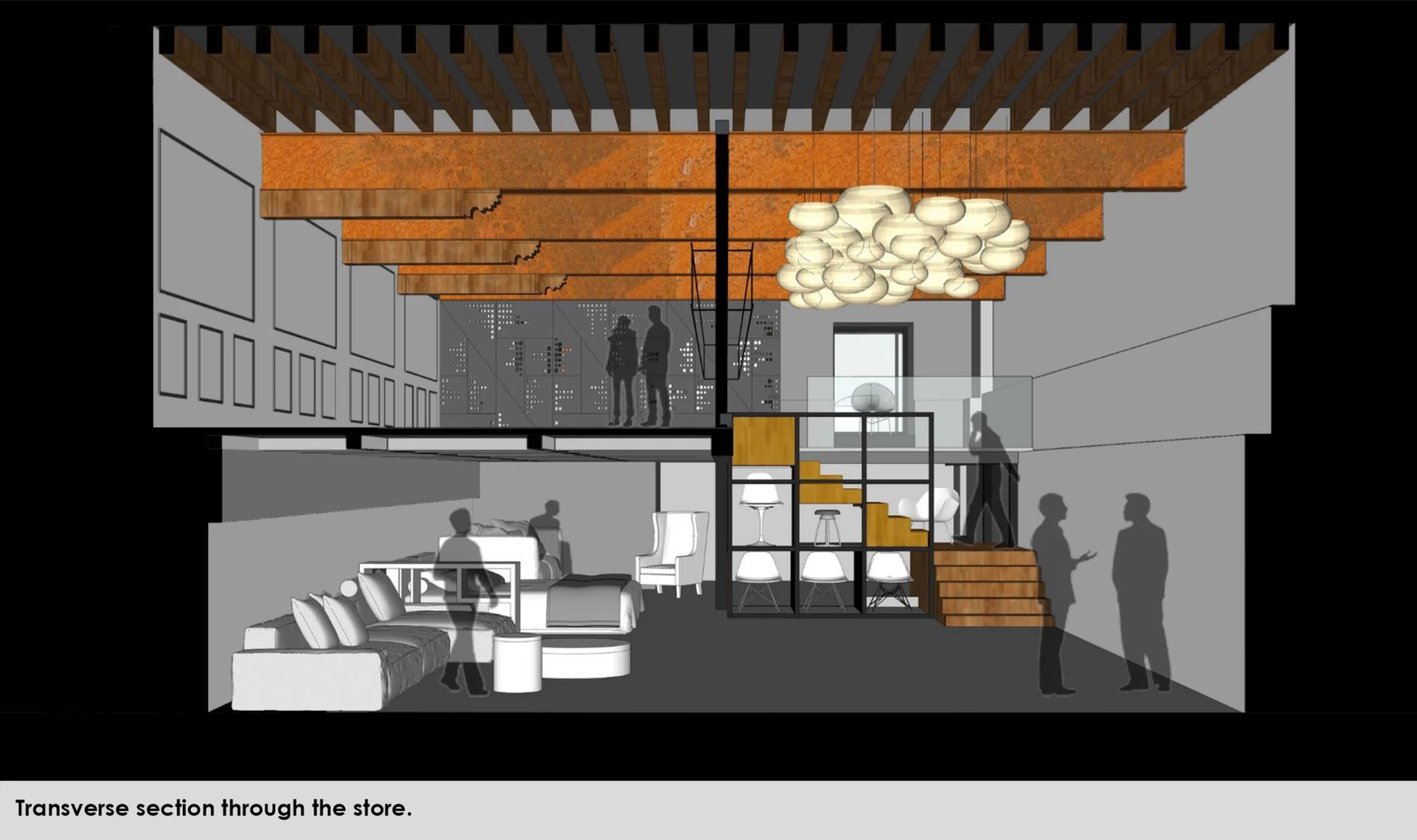 At the core of the transformation is the restructuring of the existing framework. A heavy grid of 50 columns originally supporting the mezzanine was dramatically reduced to just two, thanks to the strategic introduction of an N-girder system. This intervention opened up uninterrupted volumes, allowing for flexible display layouts and improved circulation.