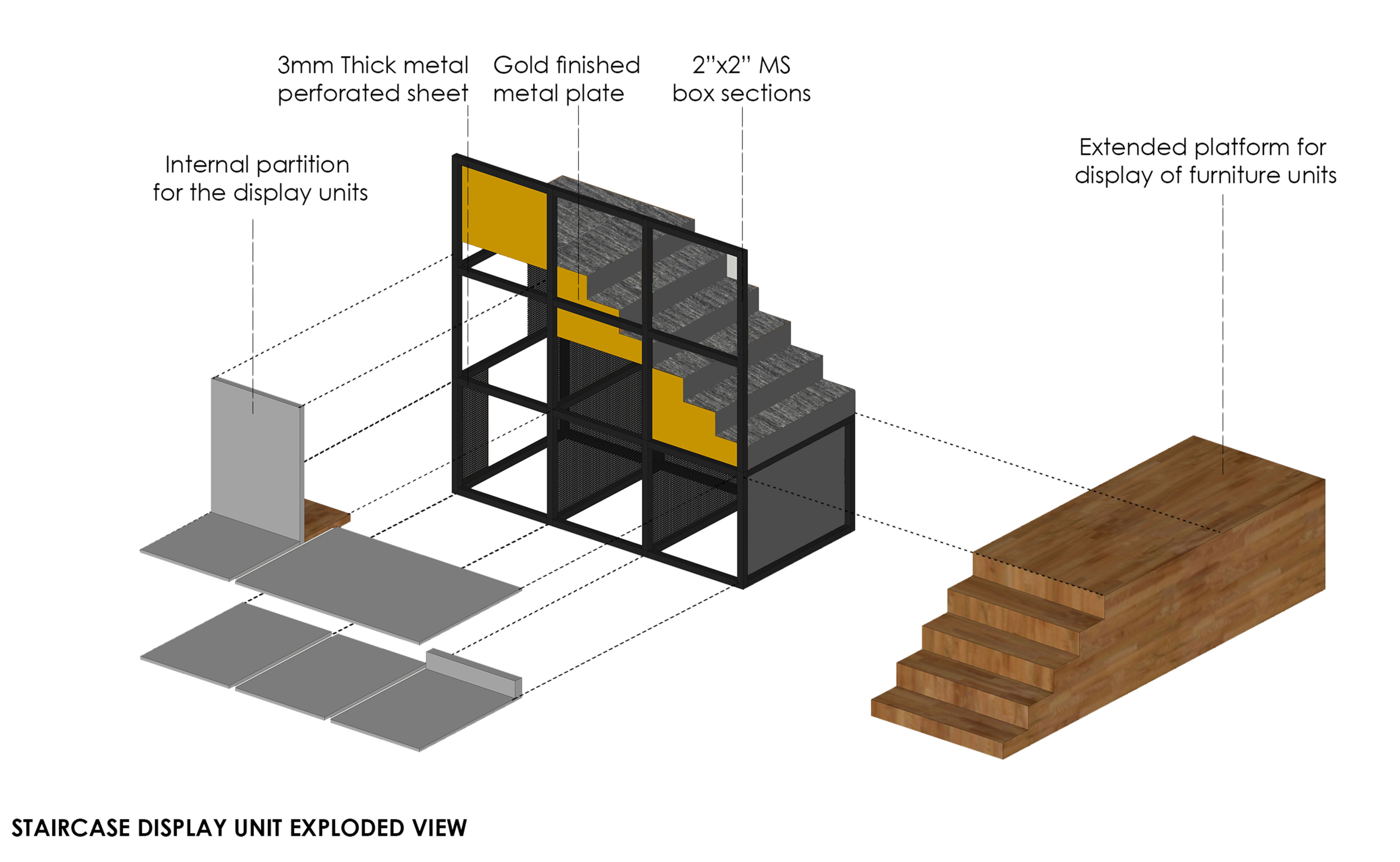 Visitors enter at the upper level, where a perforated steel screen subtly separates the lobby from the main showroom, setting up a layered visual reveal. From here, a custom-designed staircase descends into the double-height lower display space, forming a spatial spine that acts as both display unit and partition, enhancing both vertical connection and product visibility.