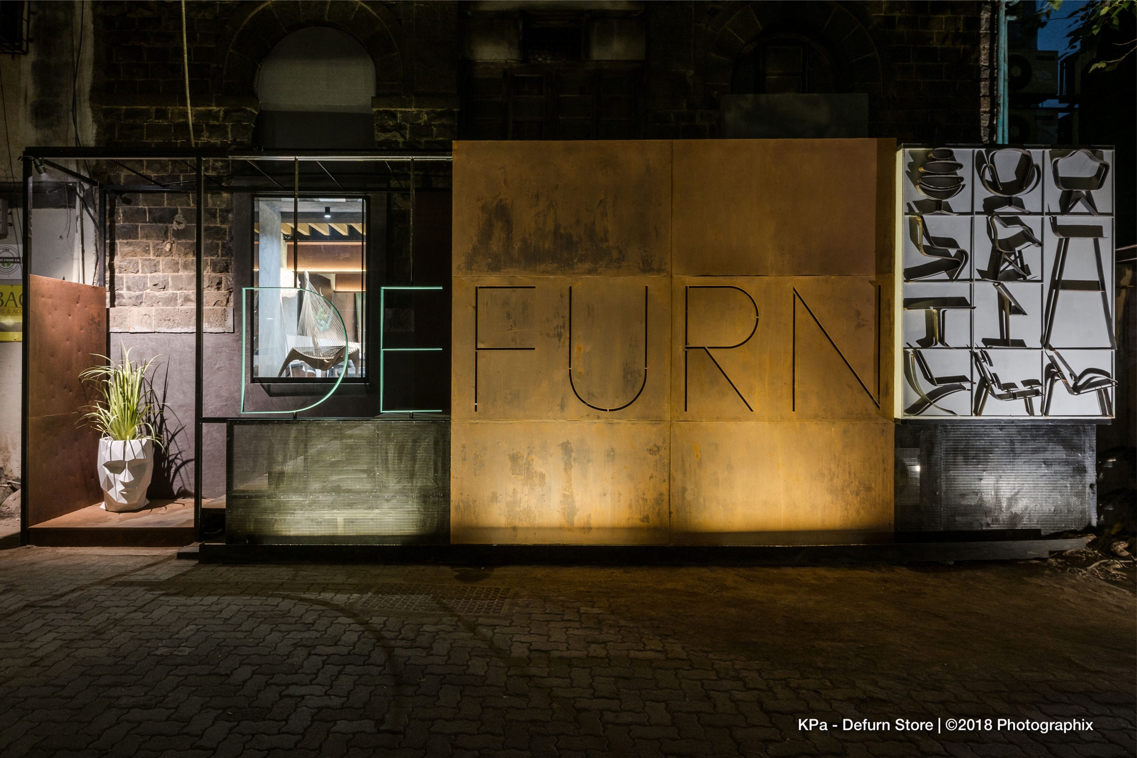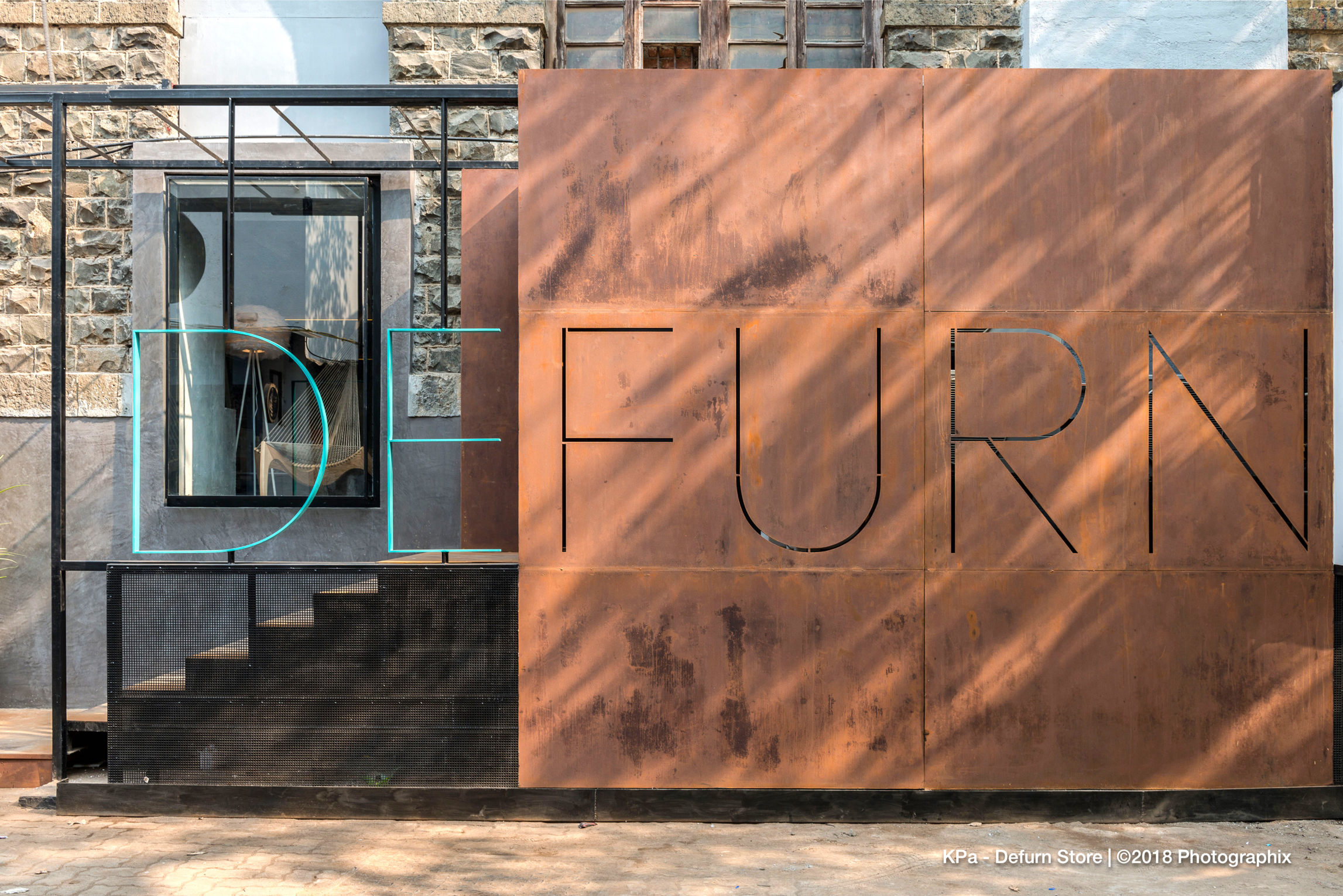 The store’s identity is boldly announced with a large Corten steel signage spelling ‘DEFURN’. The sculptural scale ensures visibility from a distance, while a clever twist in branding and function, part of the signage is designed to slide open, enabling seamless movement of furniture in and out of the store.