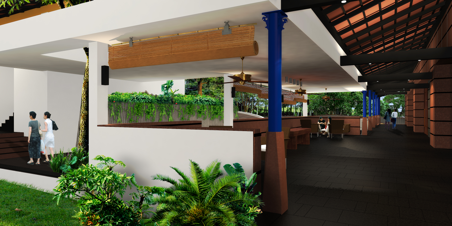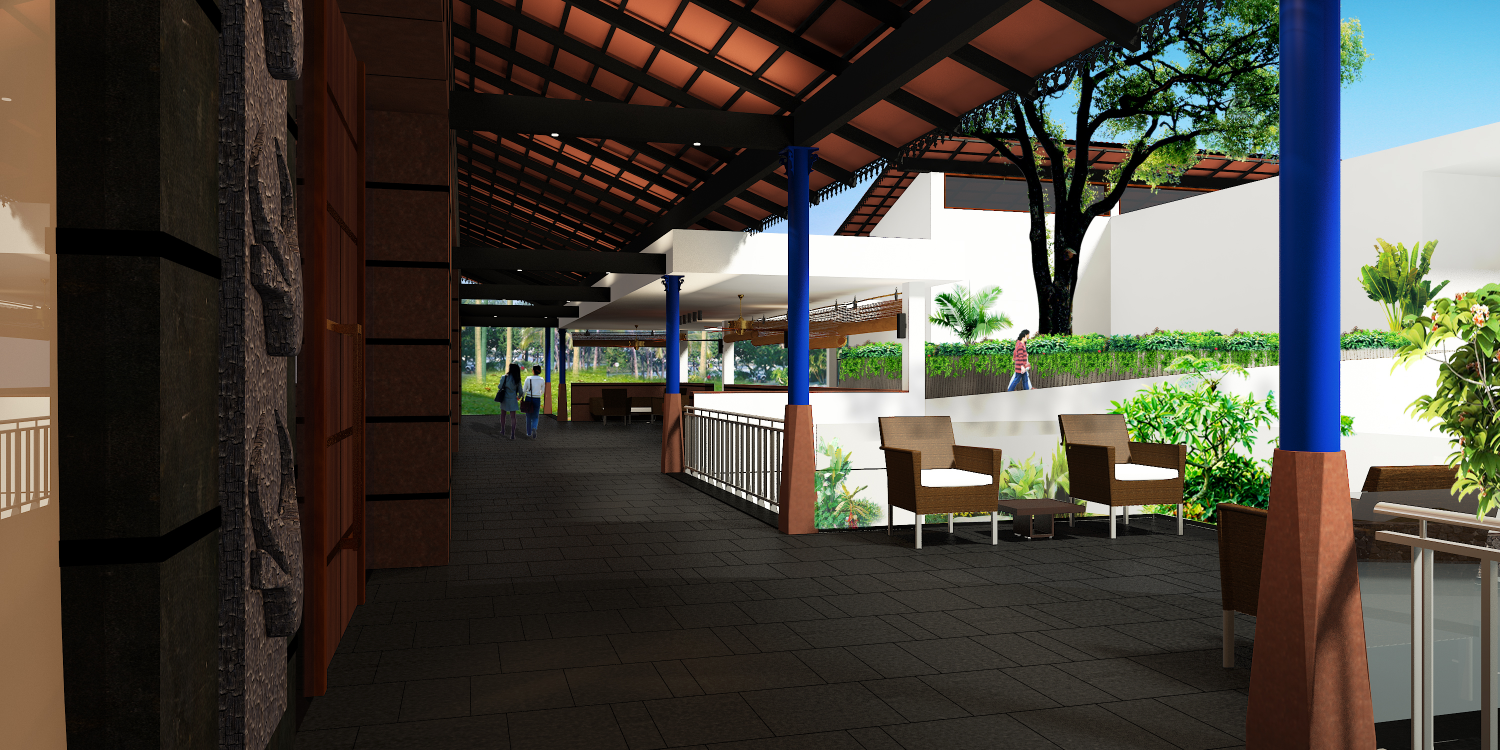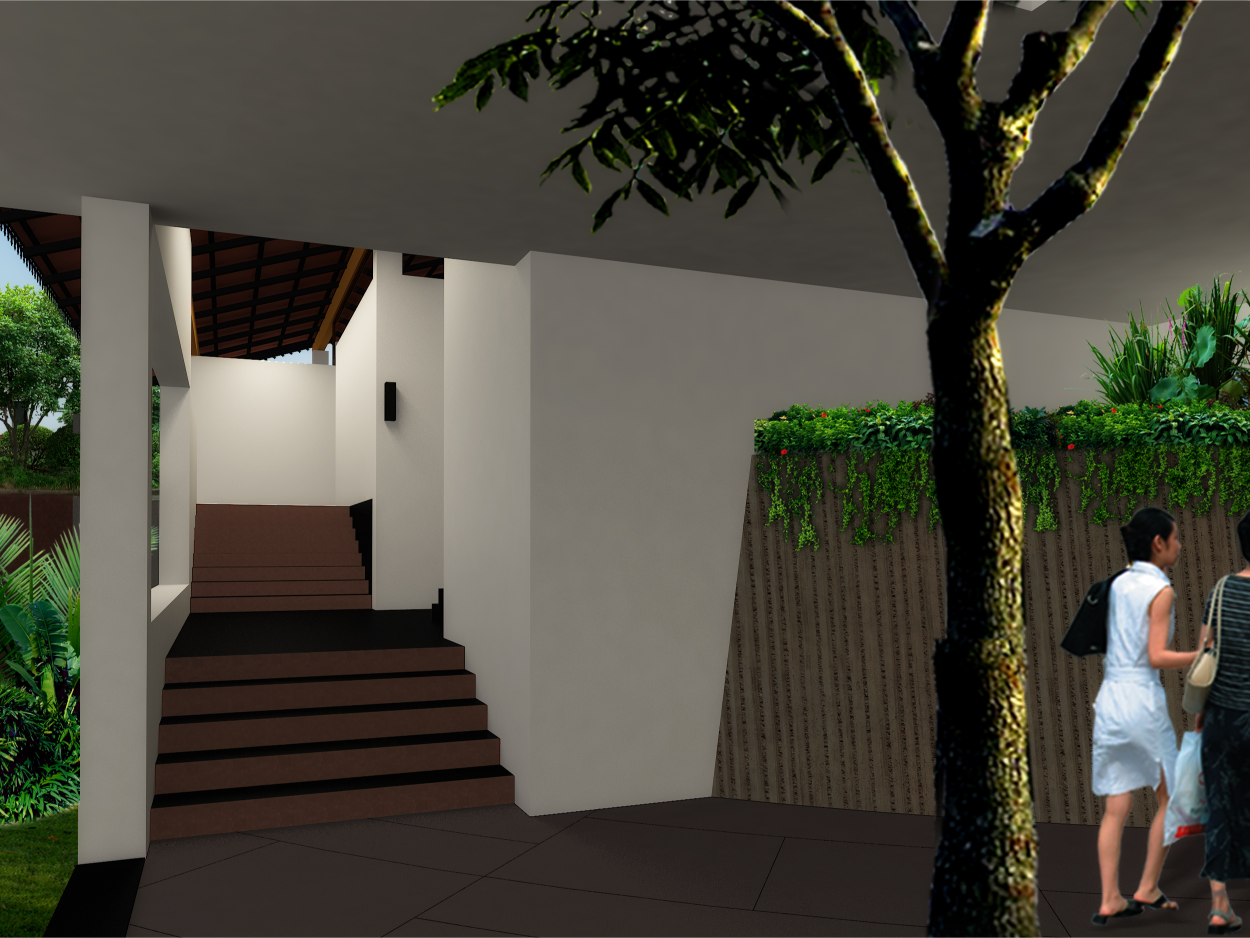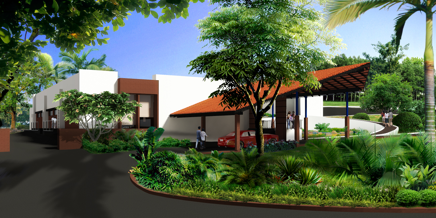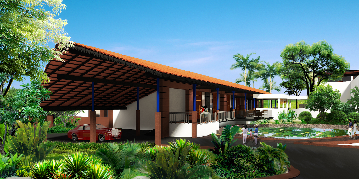 The arrival experience was reimagined with a dramatic sloping beak-shaped roof, designed to shelter ceremonial processions and welcome guests with a sense of grandeur. This leads into an expansive, elevated covered spine — a wide access corridor thoughtfully integrated around an existing water body and mature trees, preserving the site’s natural character.