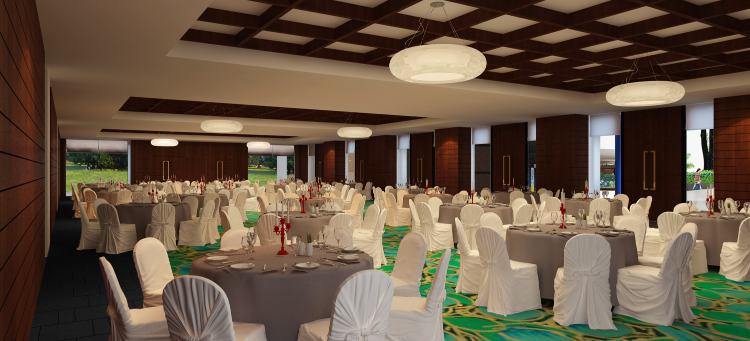 The banquet hall extension opens into a semi-open verandah featuring a stretched fabric roof, serving as a transitional buffer between the indoor venue and the lush greens beyond. Throughout the project, the expression of materiality embraces a rustic yet luxurious palette — a harmonious dialogue between built form and nature.