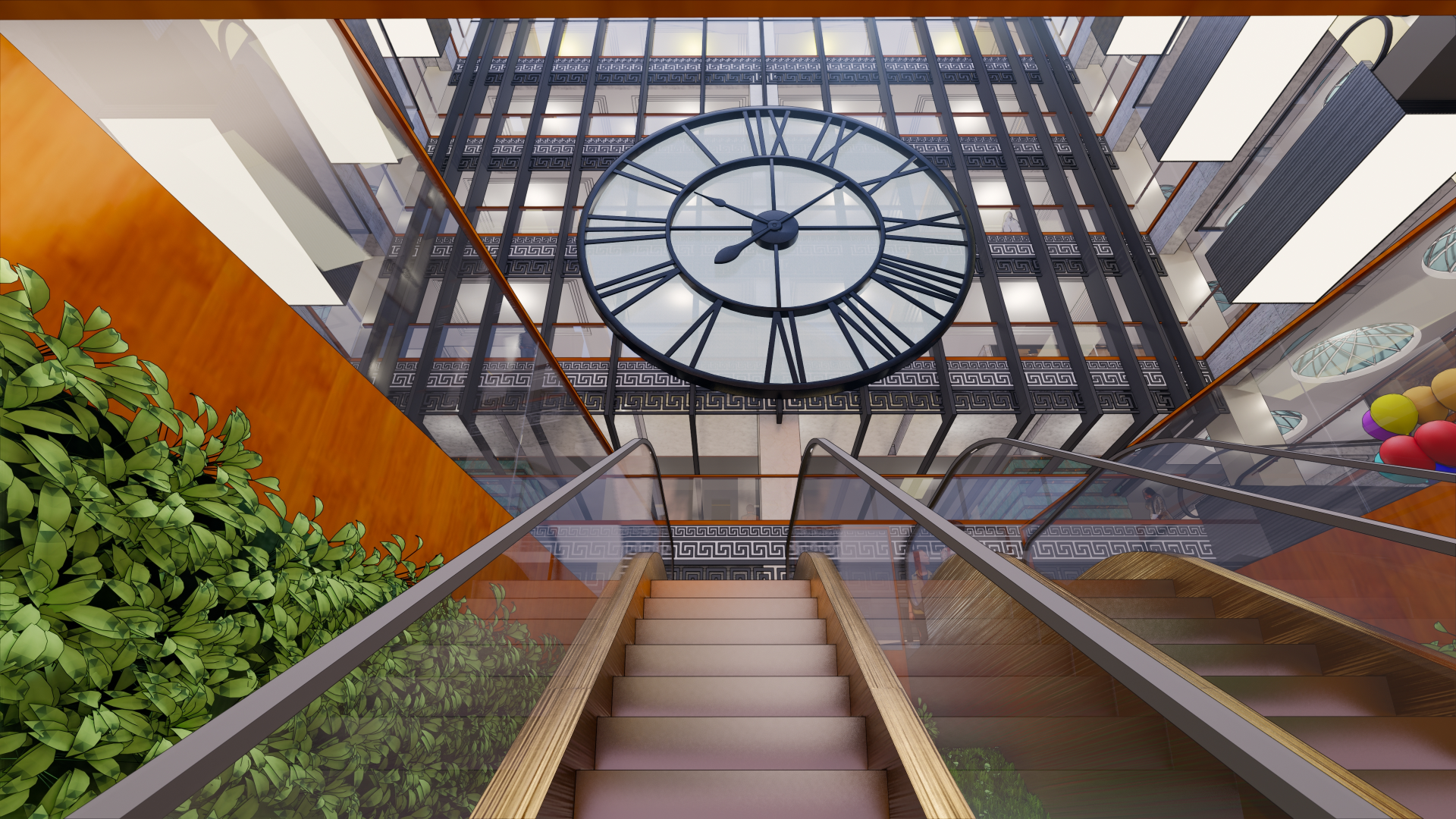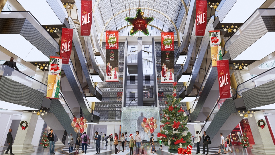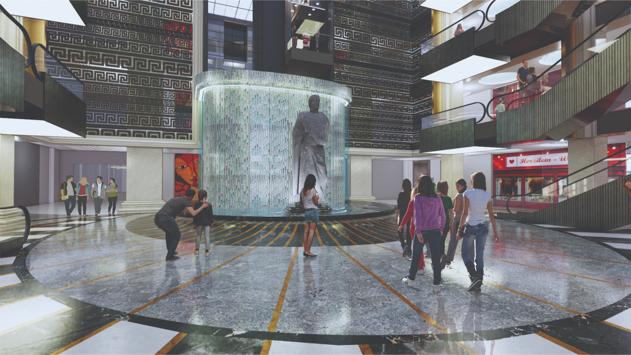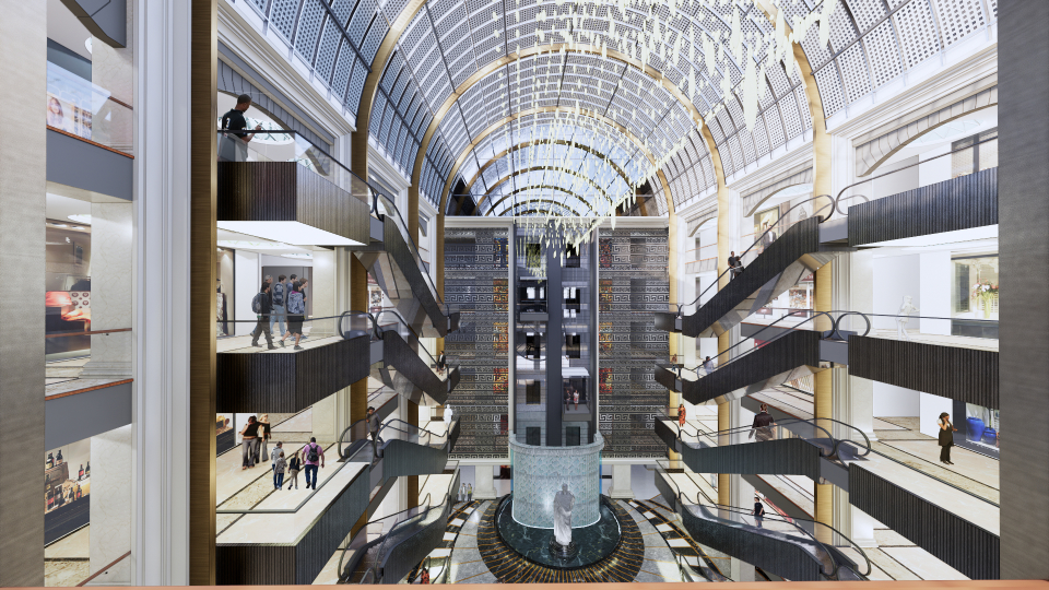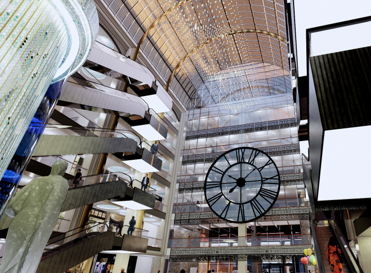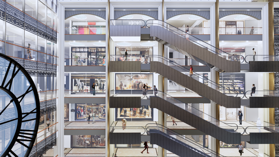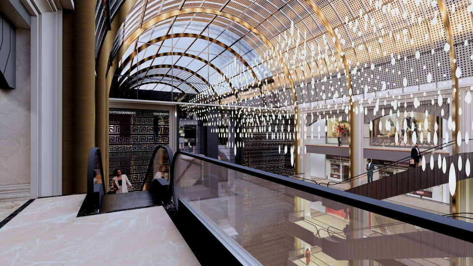 At the heart of the mall lies a grand central atrium, crowned by a dramatic glass vault that culminates in a copper-clad dome at one end. Beneath this dome sits an exclusive fine-dining restaurant, offering views across the bustling atrium below. Suspended from the dome is a custom-designed chandelier, running the entire length of the atrium—a luminous centerpiece that adds a sense of grandeur and festivity.