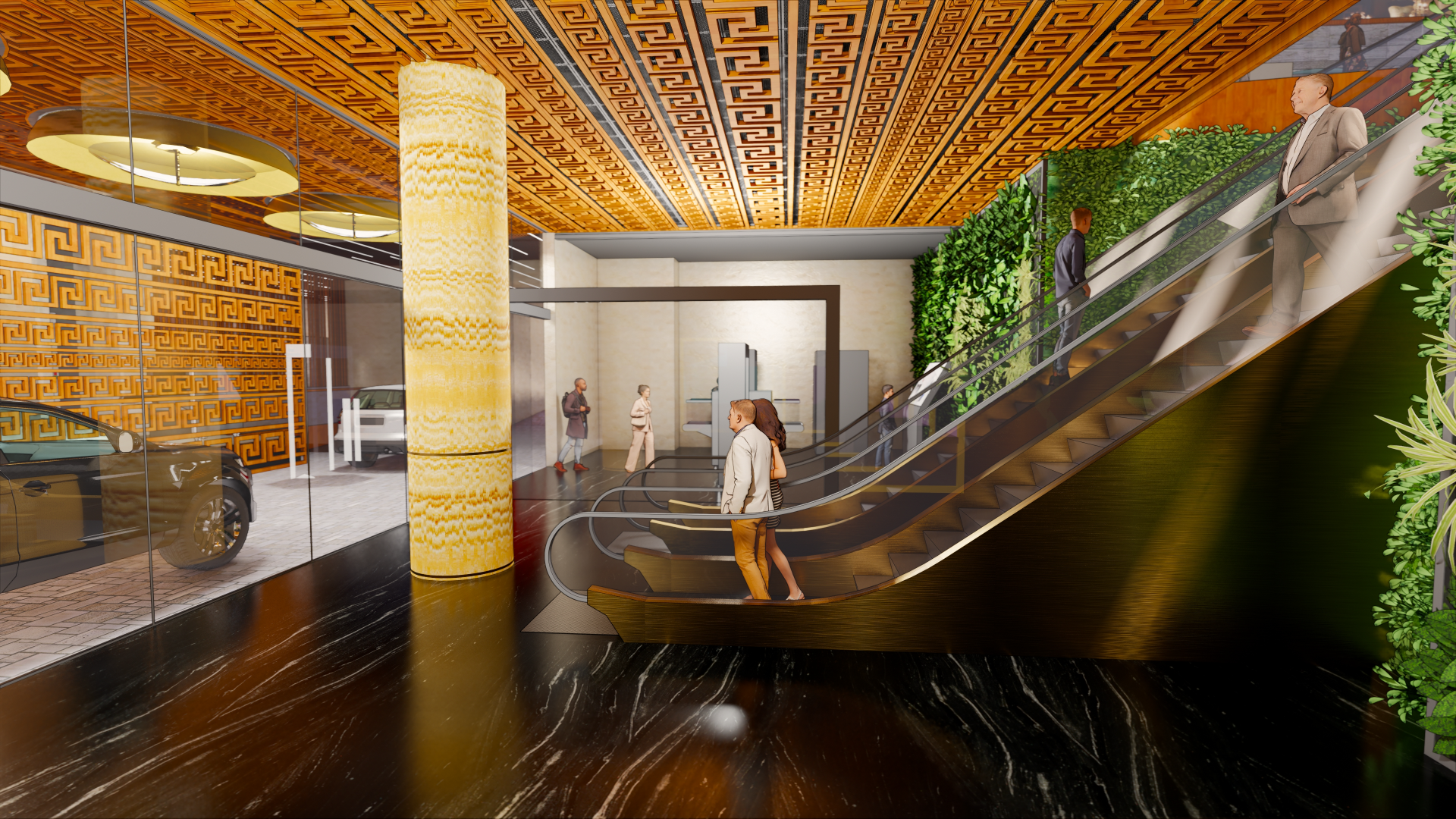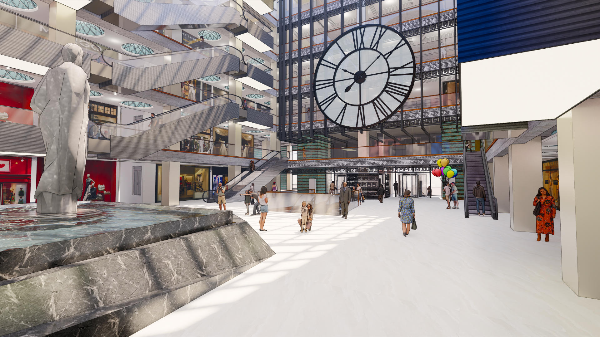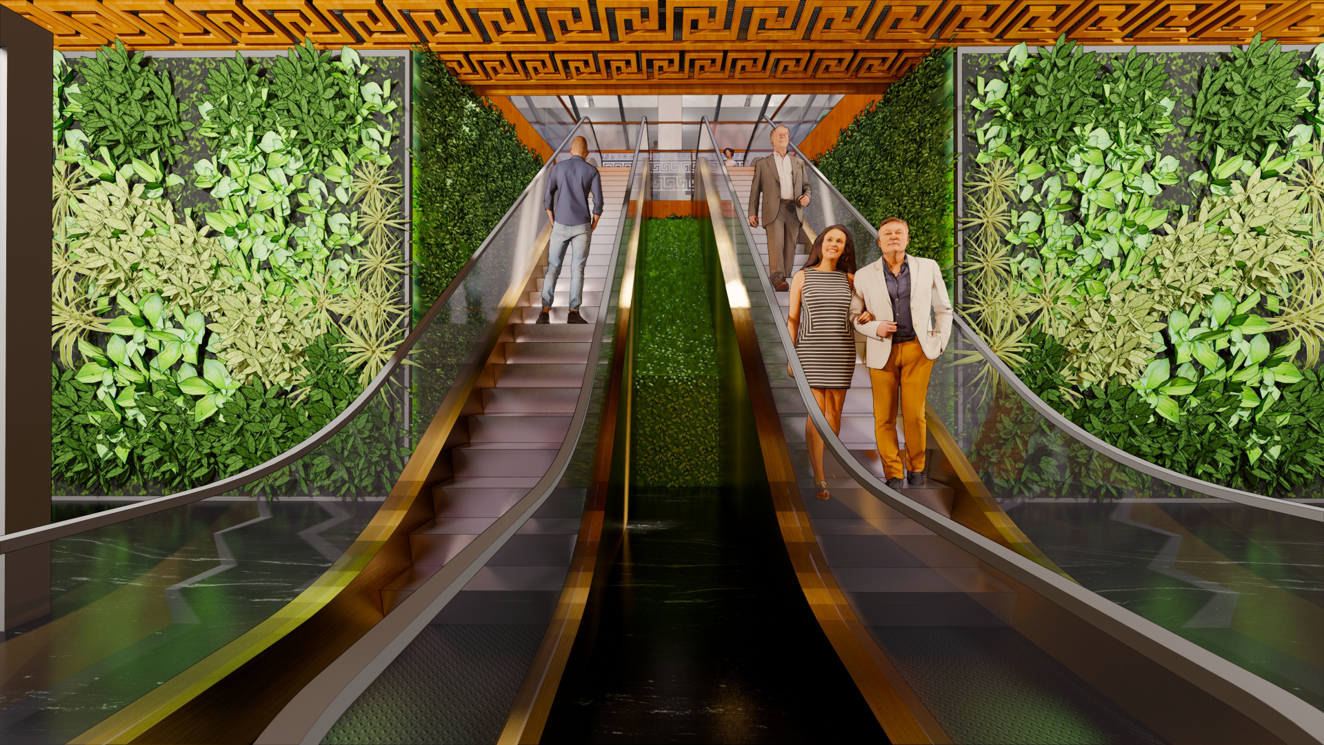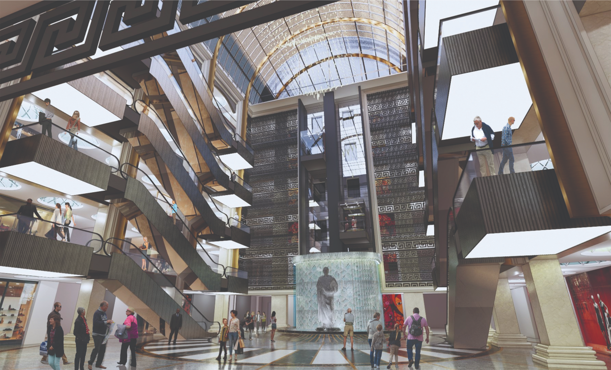 At the heart of the mall lies a grand central atrium, crowned by a dramatic glass vault that culminates in a copper-clad dome at one end. Beneath this dome sits an exclusive fine-dining restaurant, offering views across the bustling atrium below. Suspended from the dome is a custom-designed chandelier, running the entire length of the atrium—a luminous centerpiece that adds a sense of grandeur and festivity.
