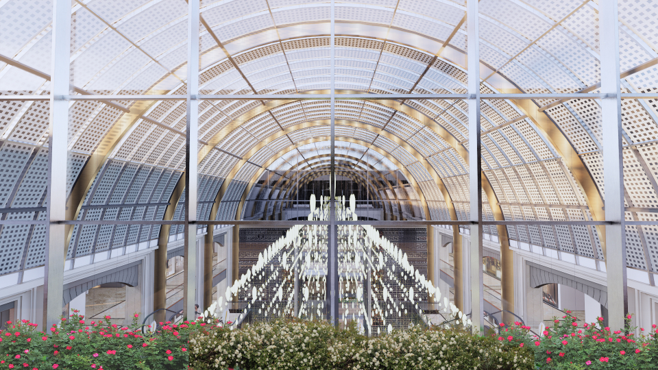 The glass vault is supported by a patinated copper structure embedded with solar cells, designed to generate sufficient power to illuminate all the mall’s common areas—an elegant fusion of form and sustainability.