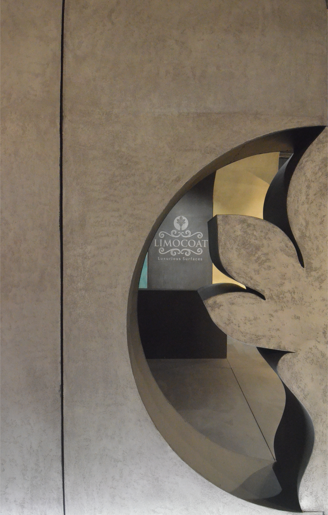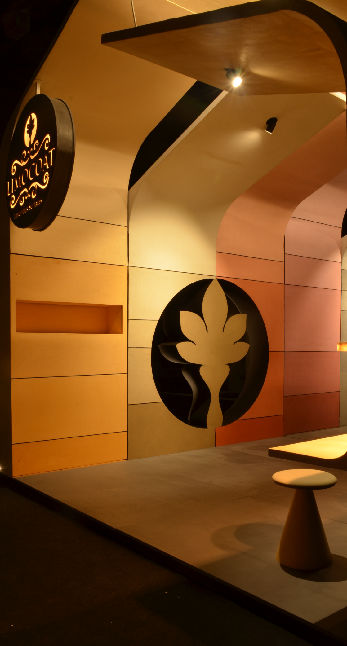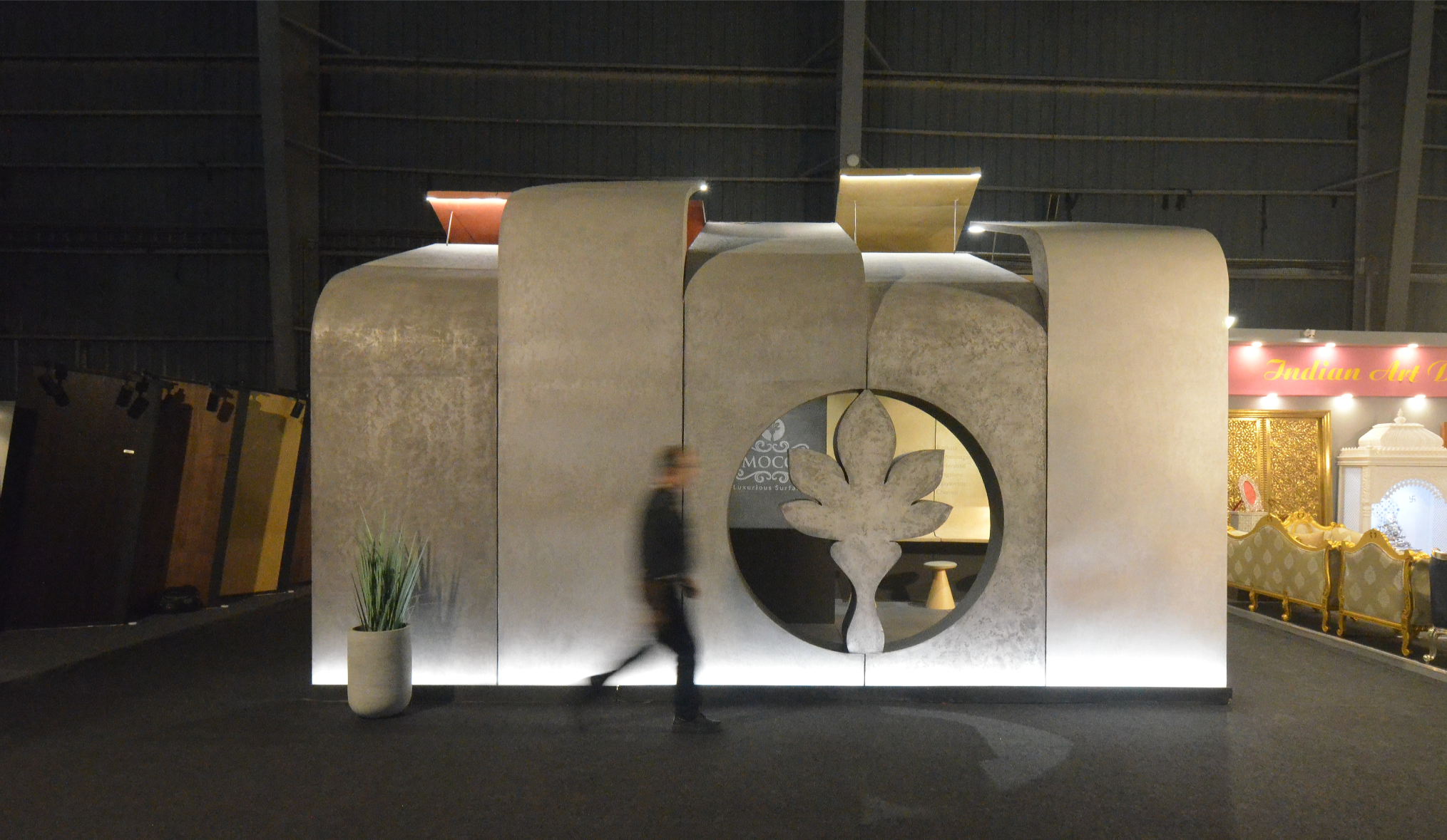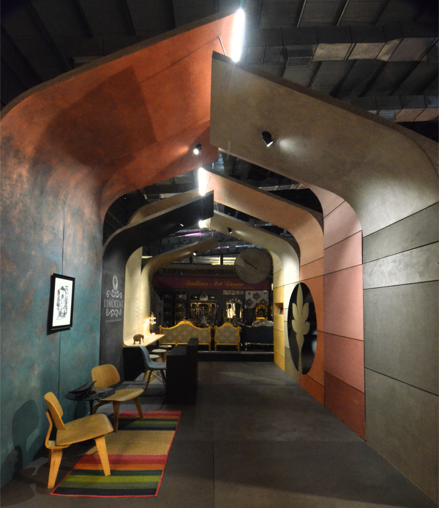 The central design gesture was a tunnel-like enclosure formed by a rhythmic assembly of curved panels in varying sizes. These panels were clad in diverse textures, shades, and finishes of Limocoat, offering visitors a tactile and visual experience as they walked through. Each panel subtly transitioned into the next, with finishes ranging from matte concretes to glossy metallics, creating a dynamic interplay of surfaces. Integrated into these continuous panels were display shelves housing product samples and catalogues, making the structure not just aesthetic but multifunctional—display, storage, and architecture in one.