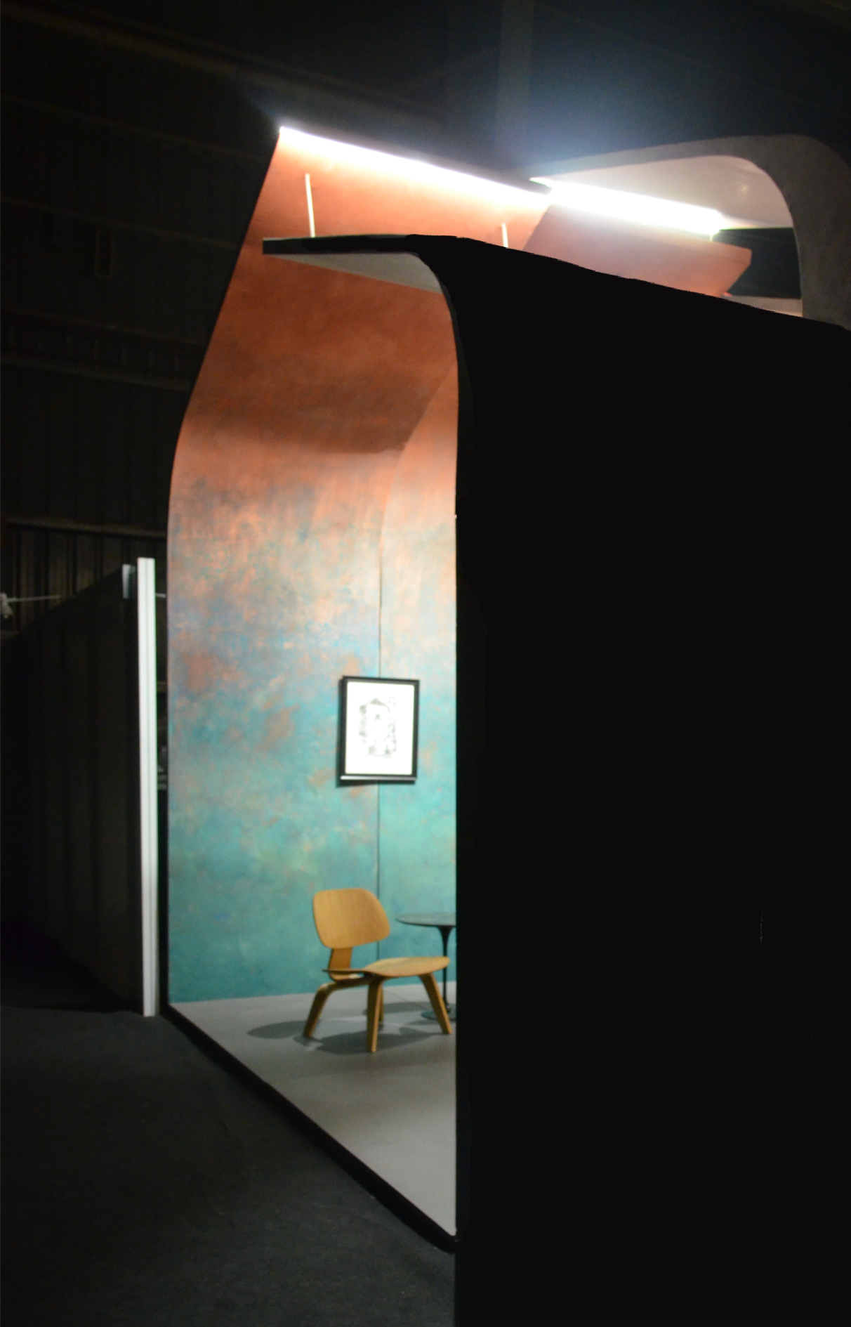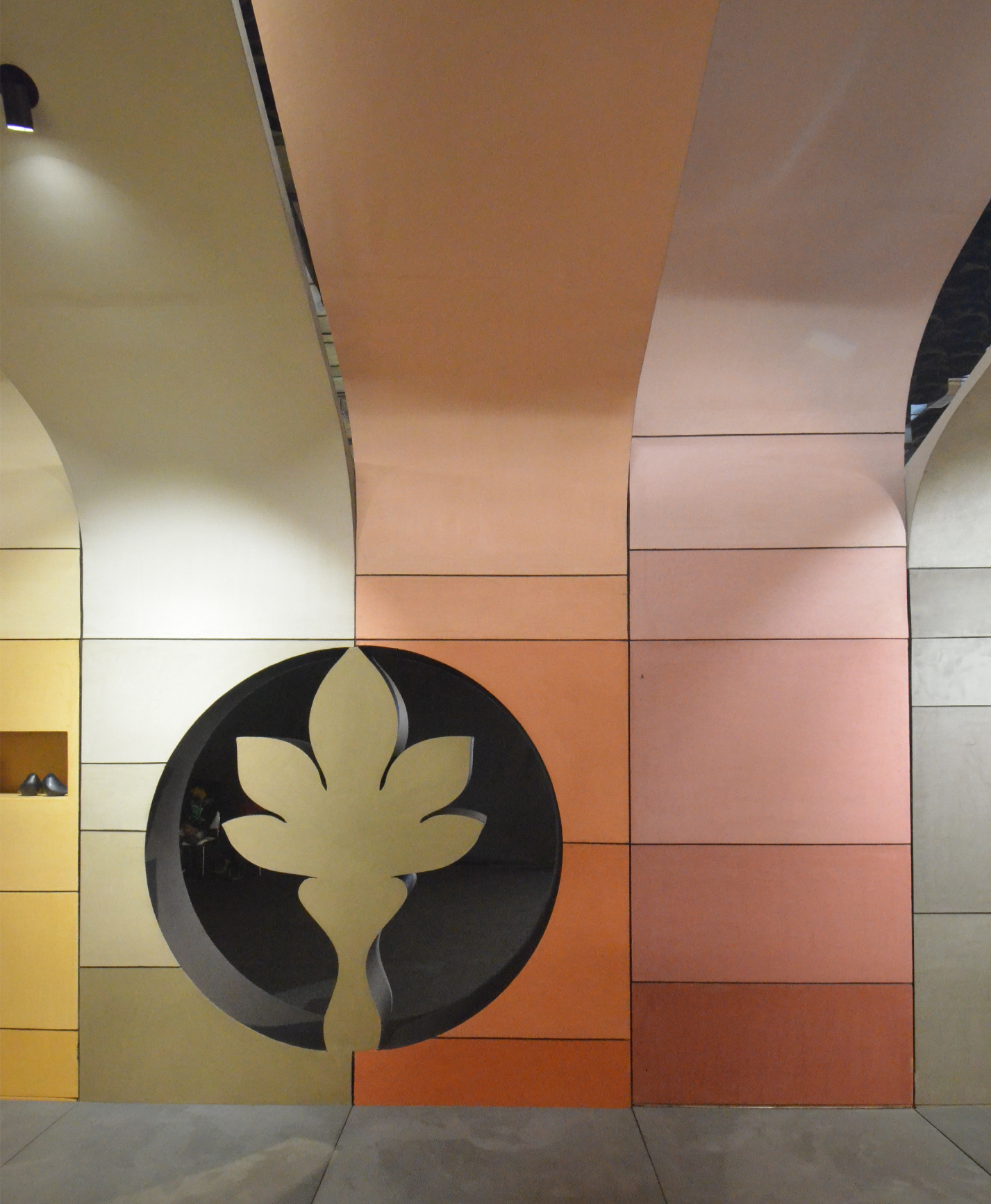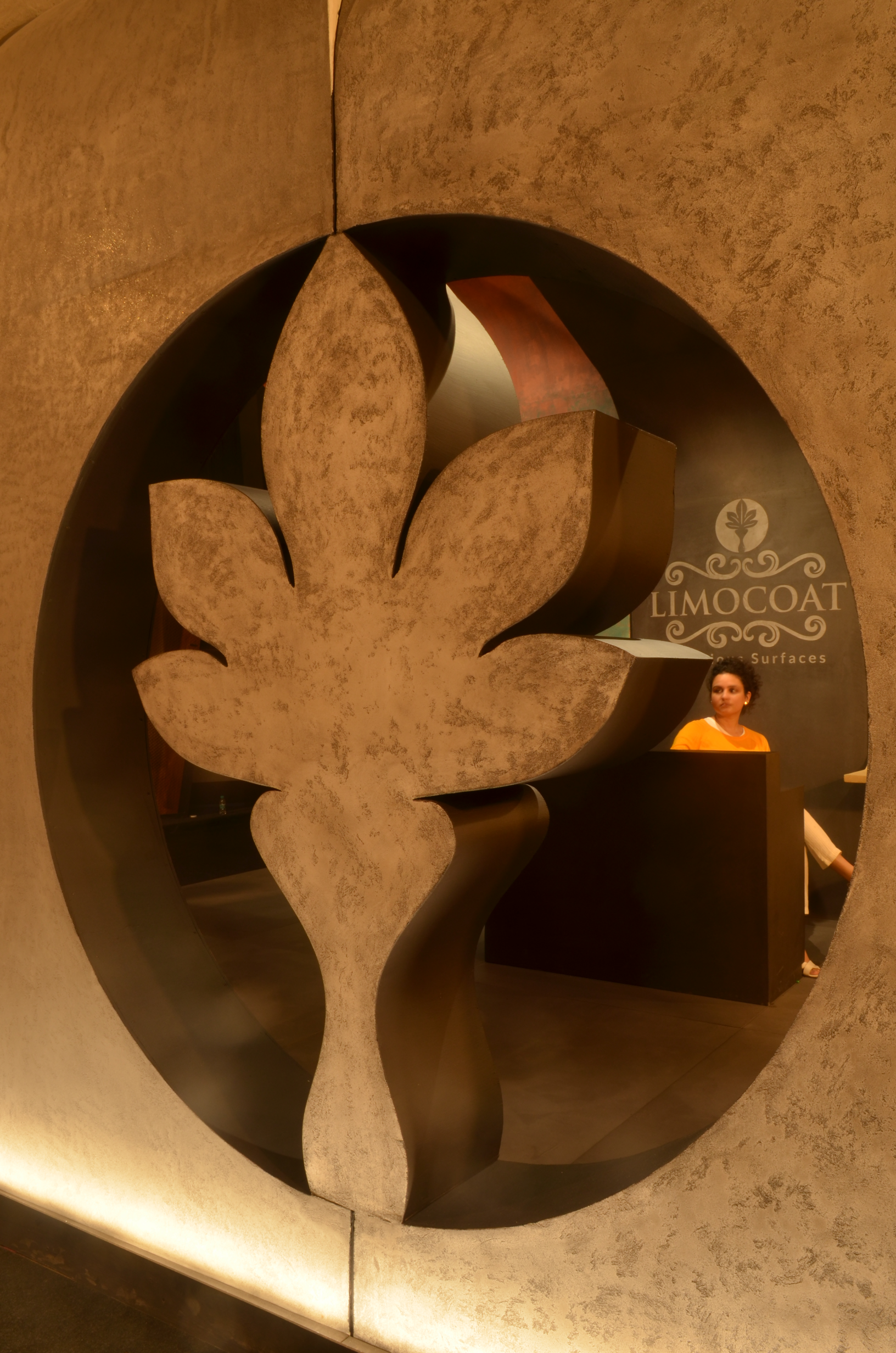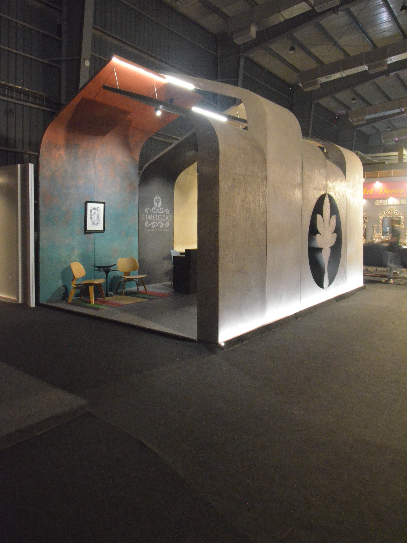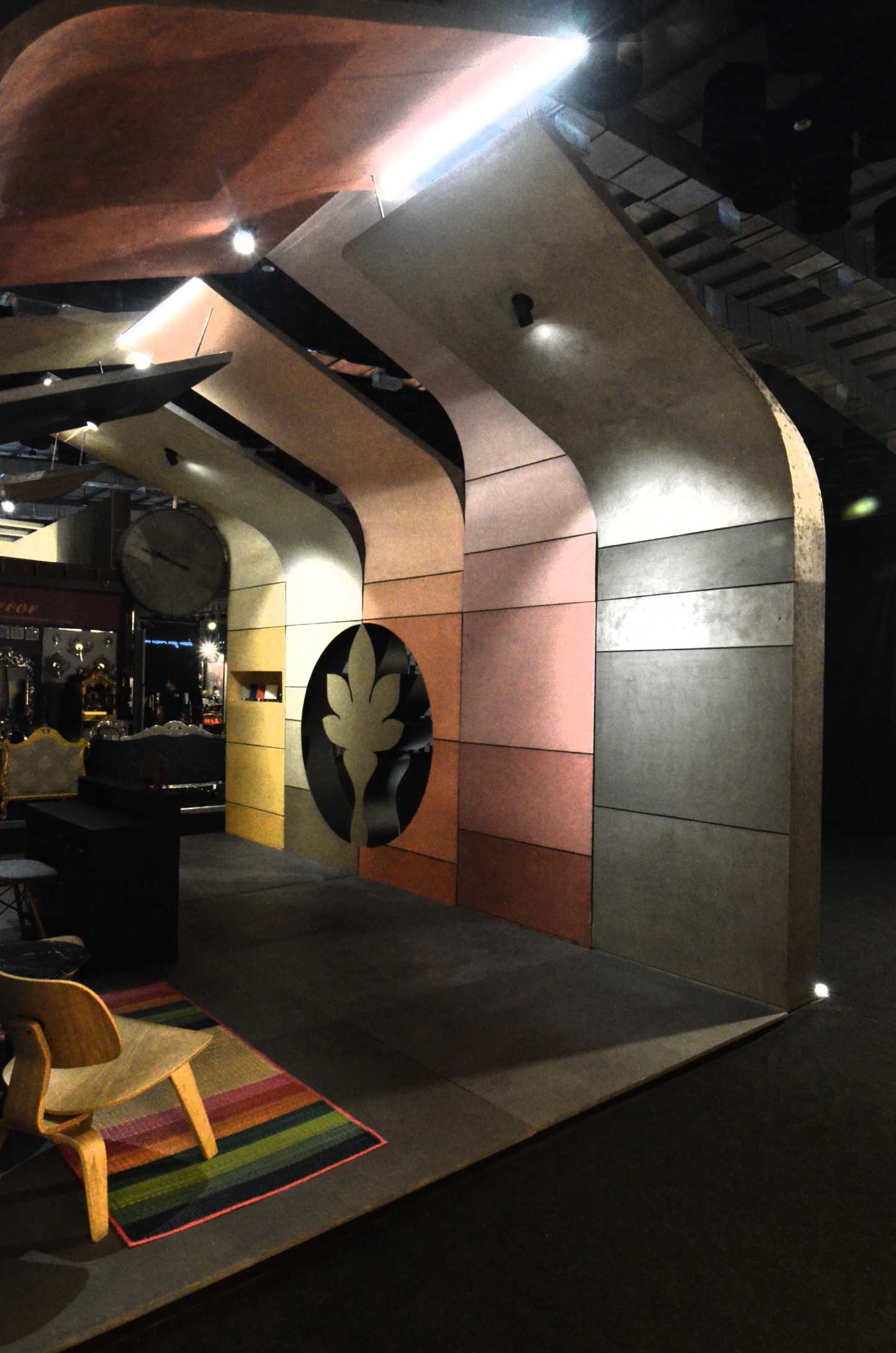The central design gesture was a tunnel-like enclosure formed by a rhythmic assembly of curved panels in varying sizes. These panels were clad in diverse textures, shades, and finishes of Limocoat, offering visitors a tactile and visual experience as they walked through. Each panel subtly transitioned into the next, with finishes ranging from matte concretes to glossy metallics, creating a dynamic interplay of surfaces. Integrated into these continuous panels were display shelves housing product samples and catalogues, making the structure not just aesthetic but multifunctional—display, storage, and architecture in one.