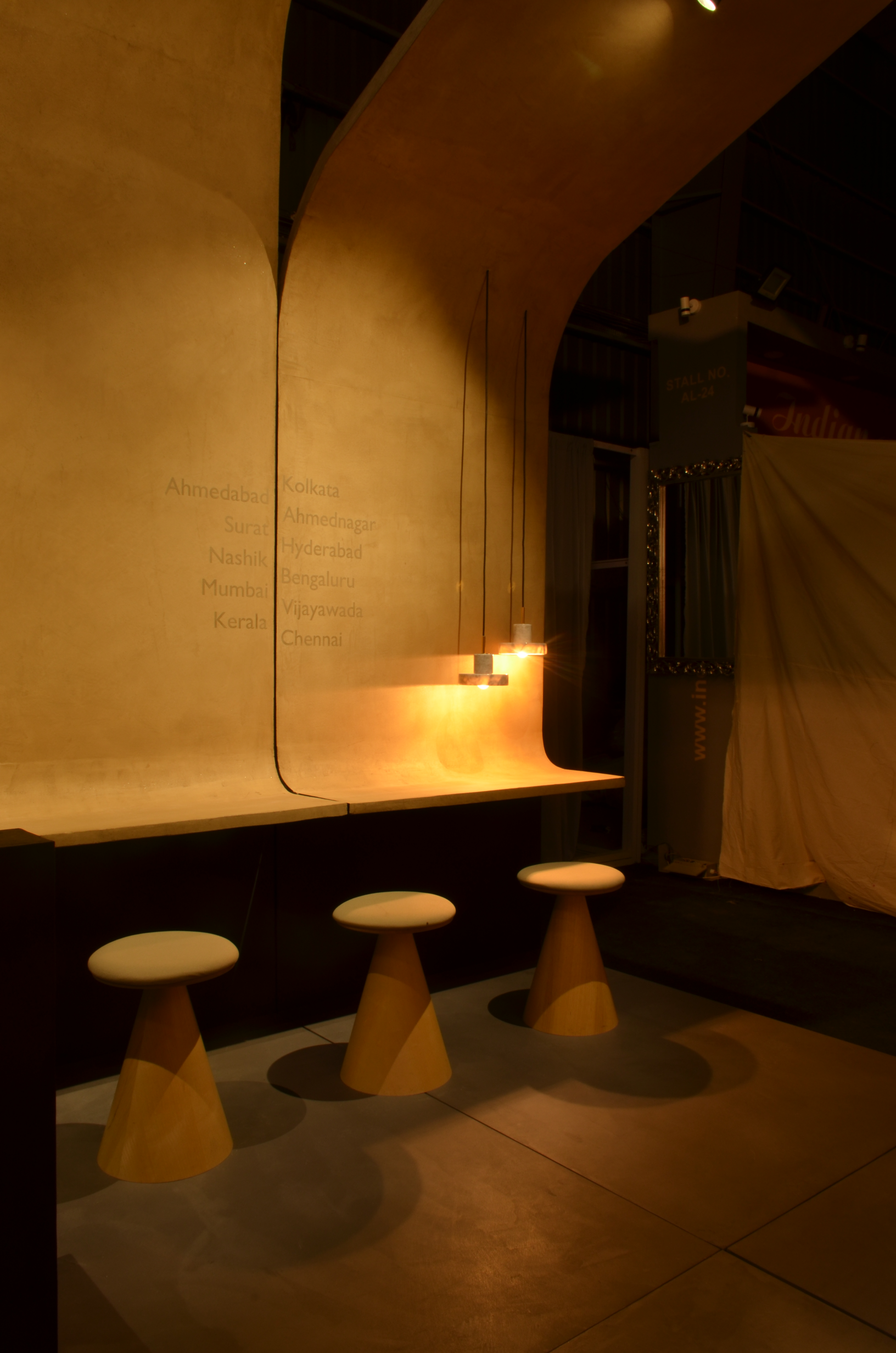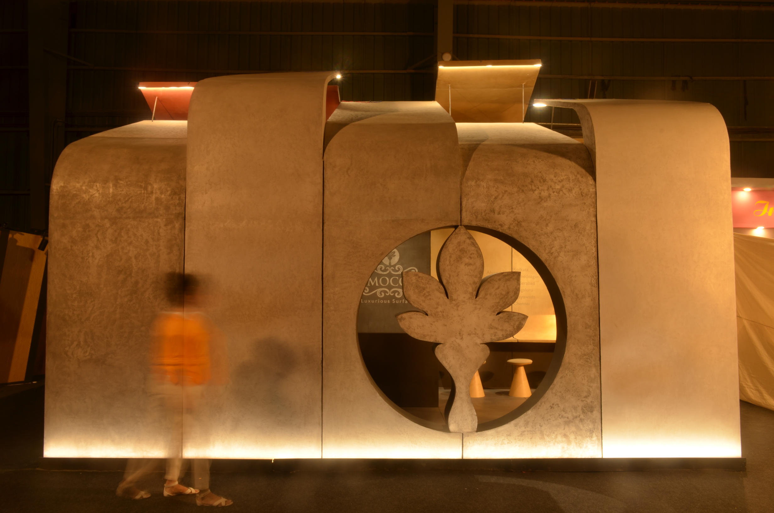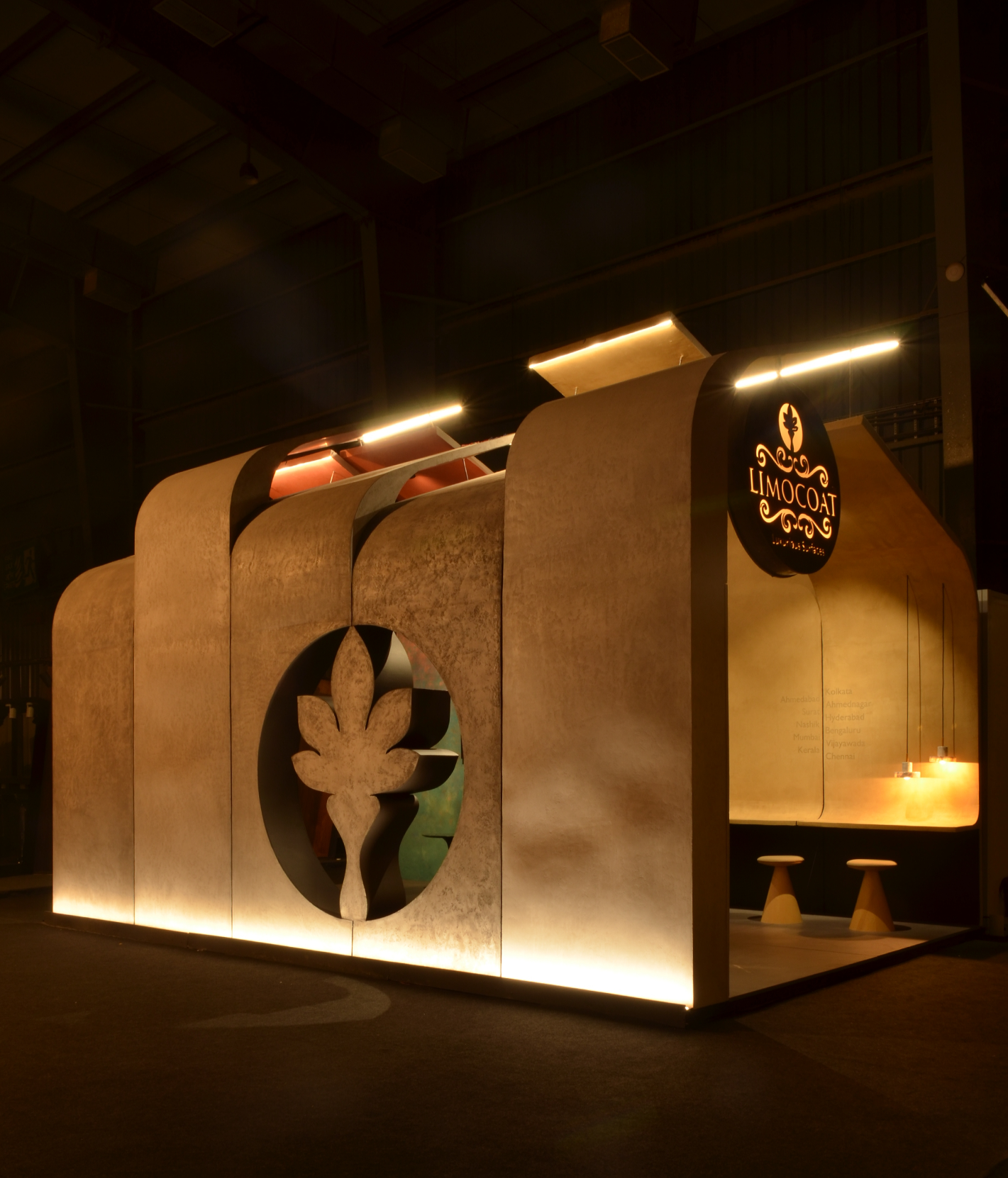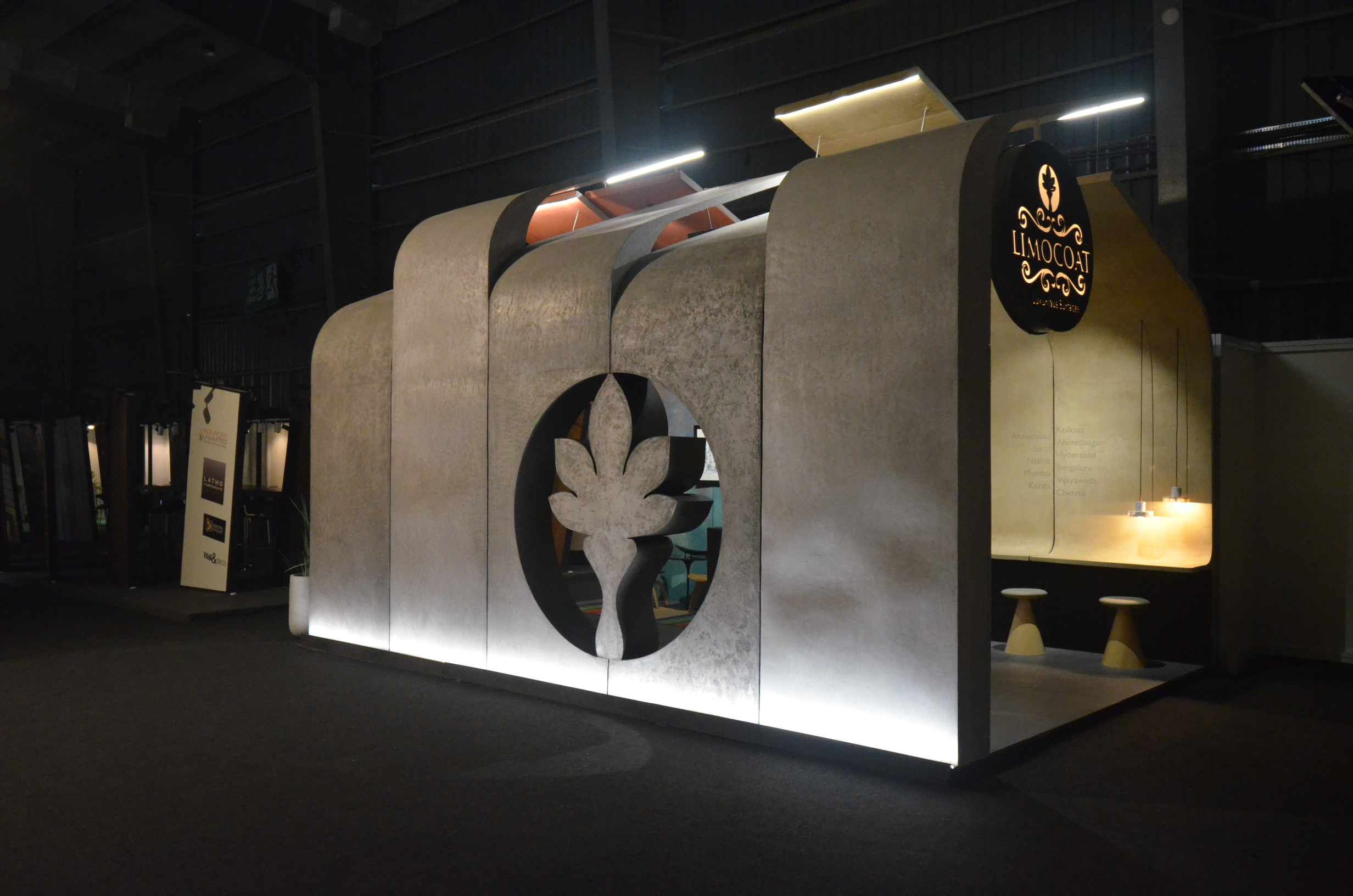 For JBR Coatings, the stall at Acetech 2019 in Mumbai was envisioned as an immersive brand experience to showcase their Limocoat range of luxury surface finishes. Rather than displaying finishes on isolated panels, the entire stall itself became a sculptural demonstration of Limocoat’s potential—a structure that embodied the product.
