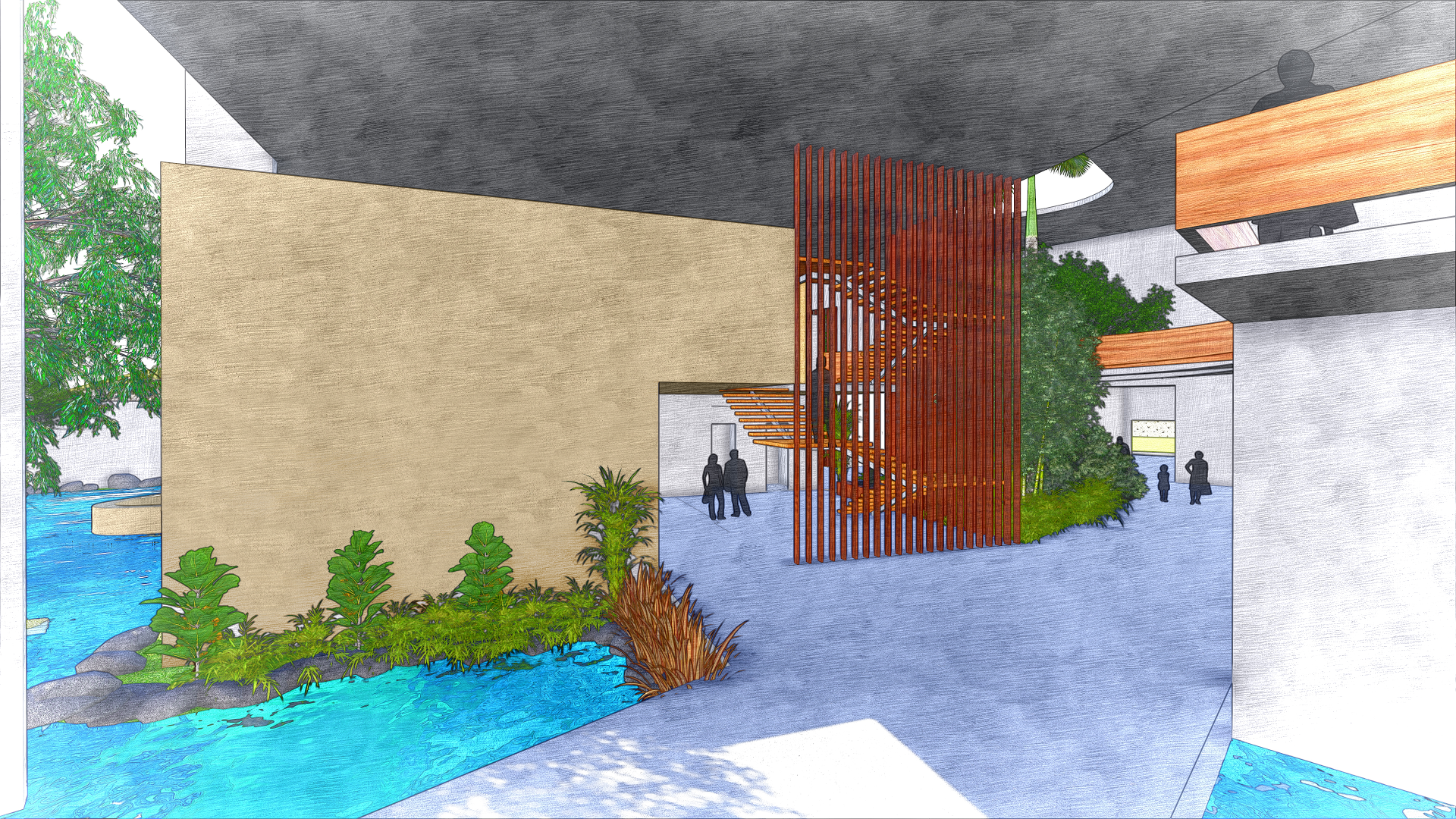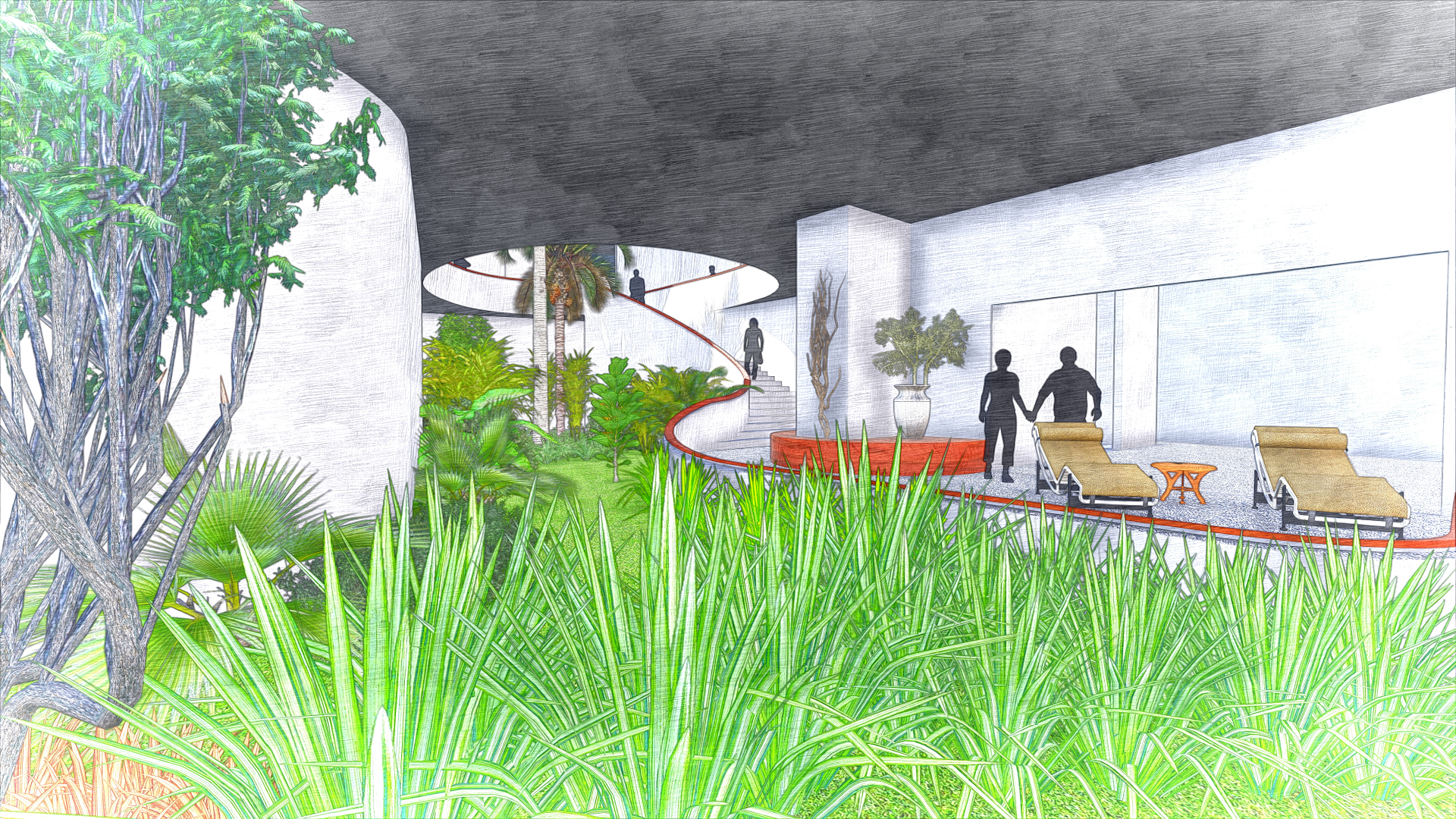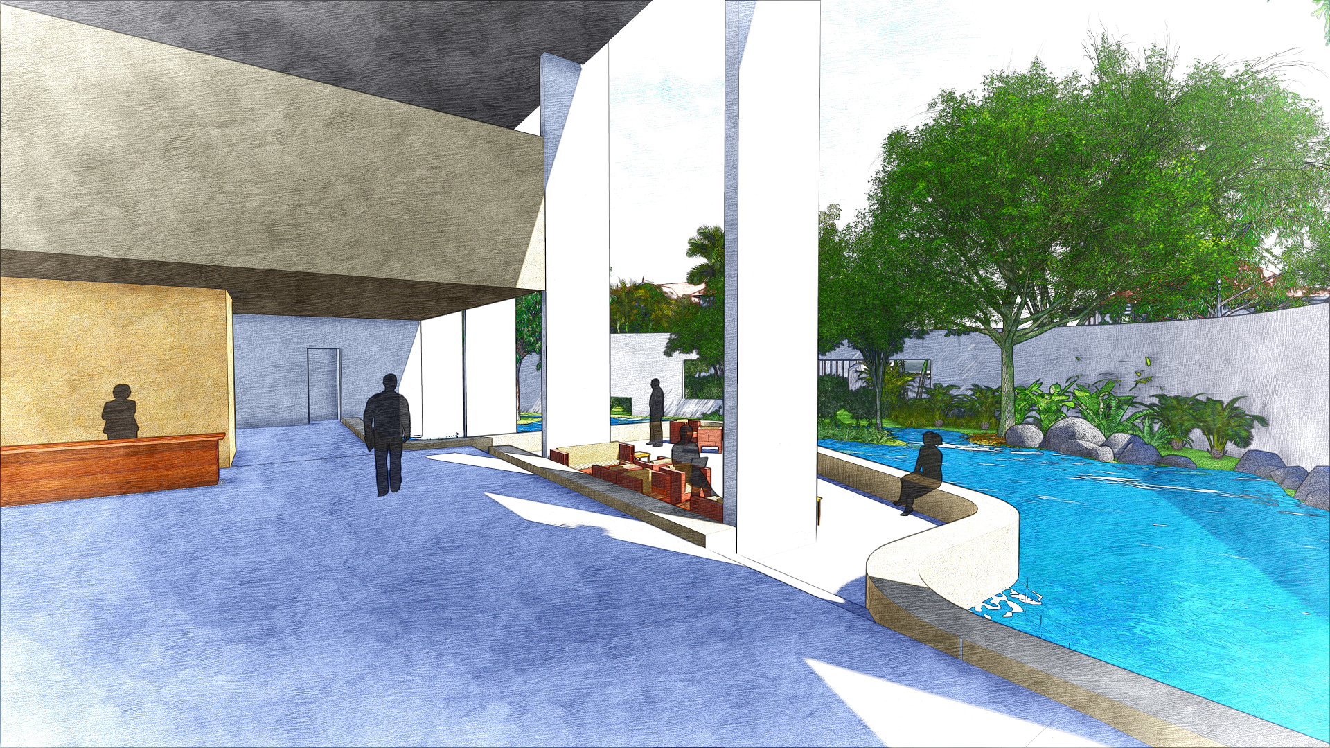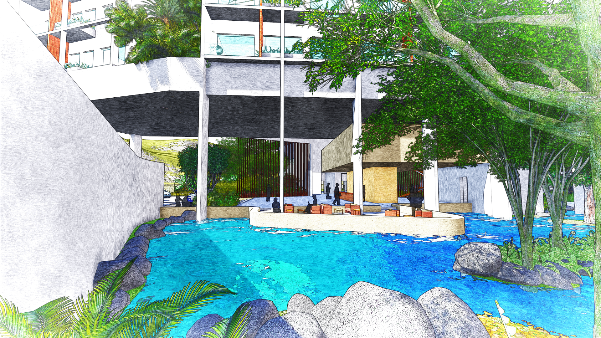 The first two levels of the annex form the vibrant social heart of the hotel. These spaces are characterized by expansive, tropical volumes with an open-plan layout, allowing the natural flow of people and sea breezes through various interconnected functions. Guests can move seamlessly between the restaurant, spa, banquet hall, and other amenities. The lobby is a grand, semi-open pavilion that captures the spirit of island hospitality—punctuated by tranquil water features, breezy lounges, and shaded waiting areas that blend indoor comfort with outdoor charm.