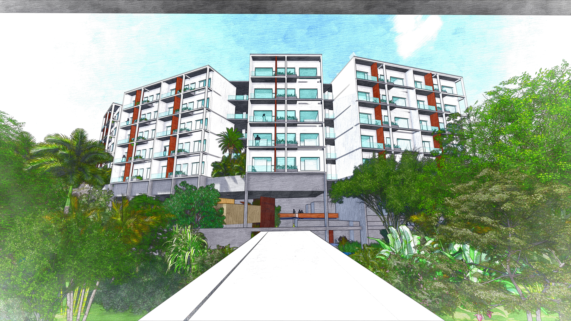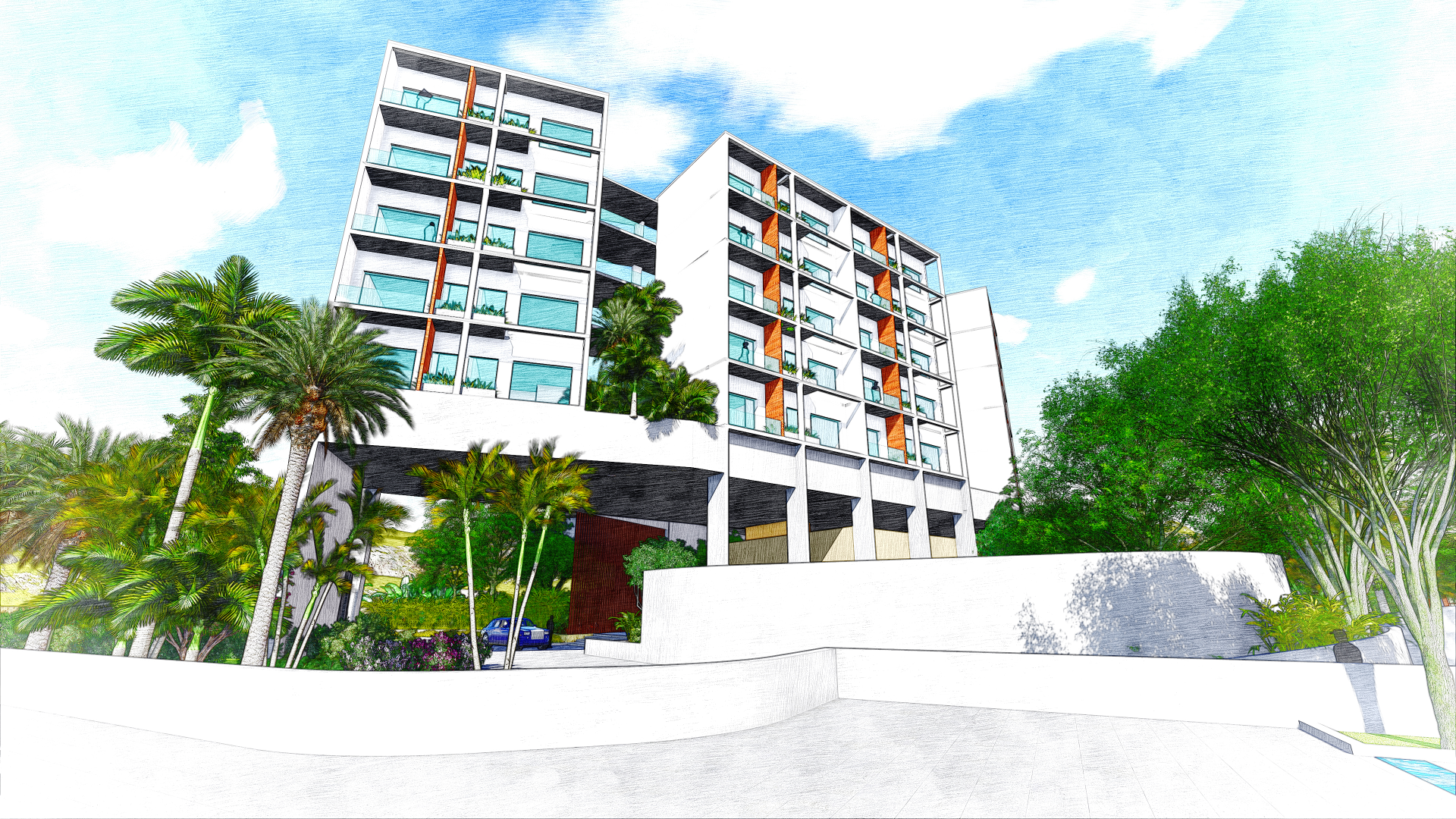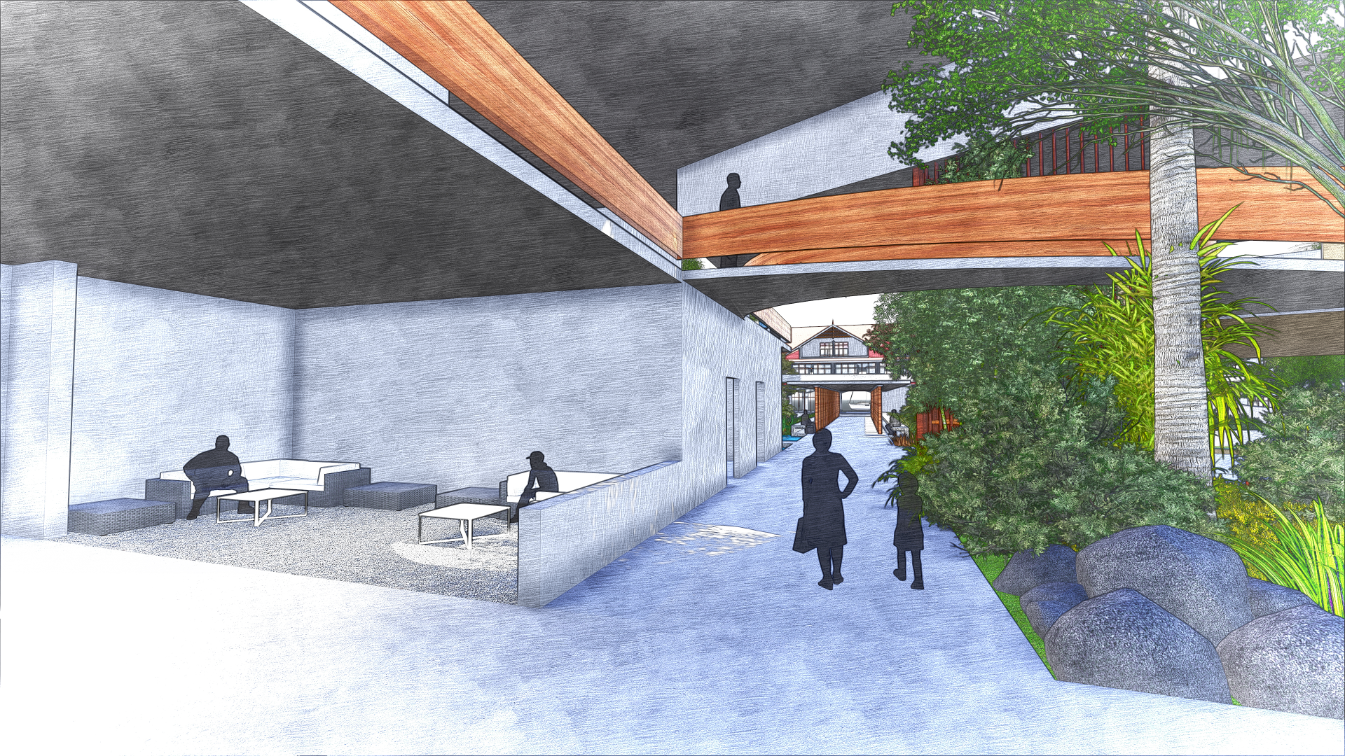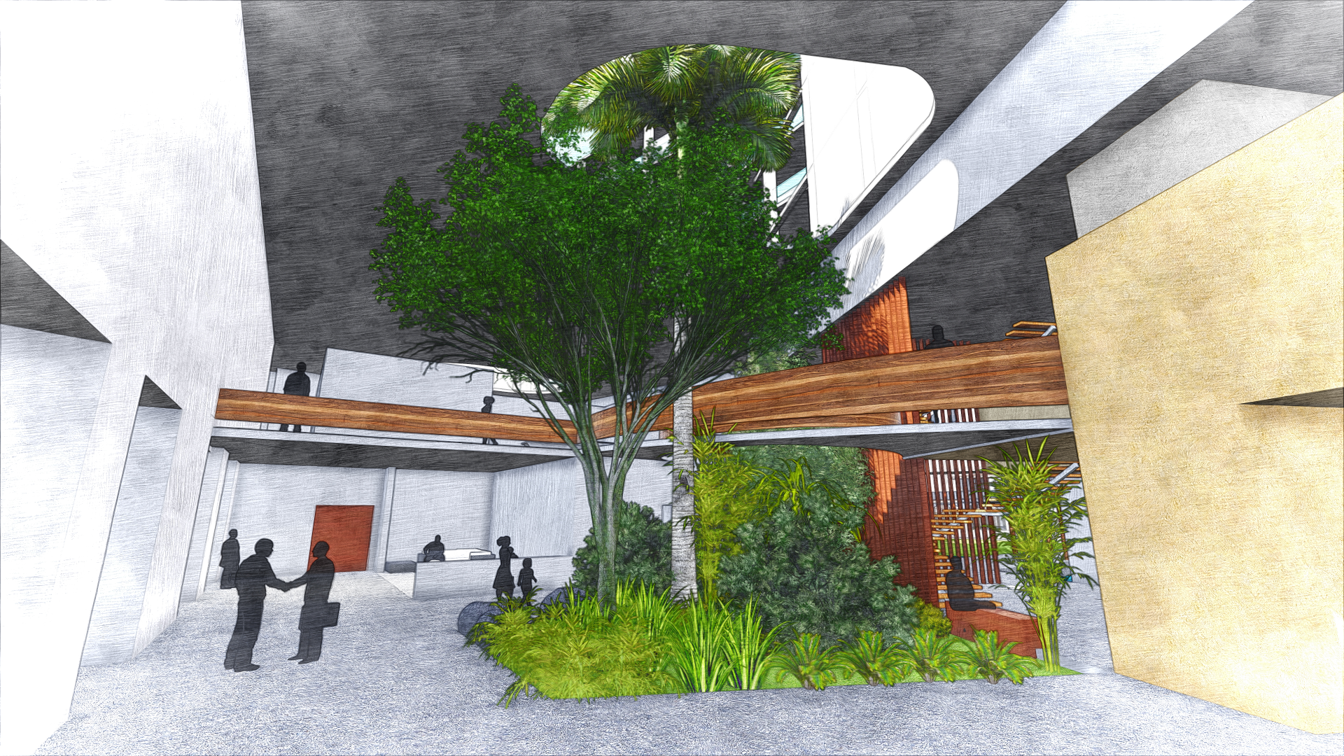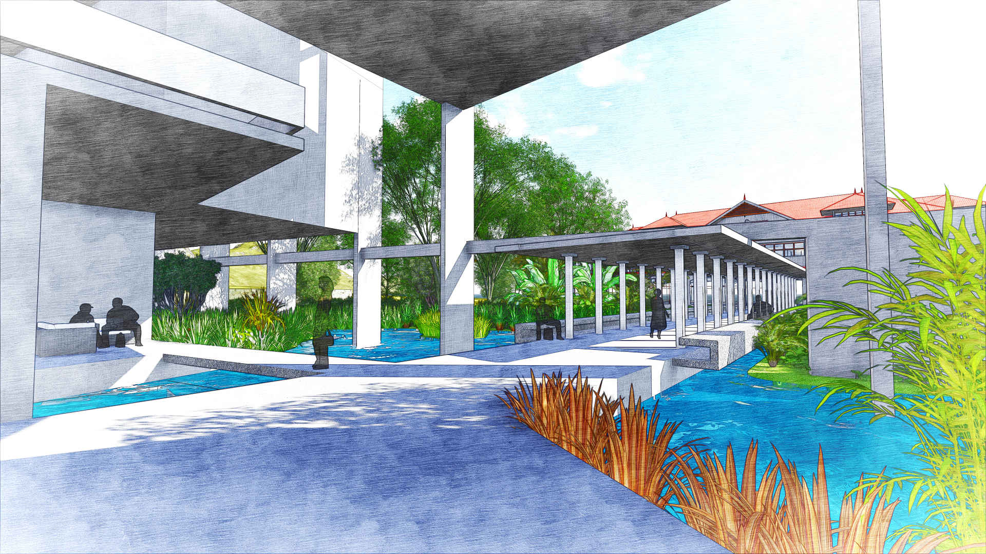 The first two levels of the annex form the vibrant social heart of the hotel. These spaces are characterized by expansive, tropical volumes with an open-plan layout, allowing the natural flow of people and sea breezes through various interconnected functions. Guests can move seamlessly between the restaurant, spa, banquet hall, and other amenities. The lobby is a grand, semi-open pavilion that captures the spirit of island hospitality—punctuated by tranquil water features, breezy lounges, and shaded waiting areas that blend indoor comfort with outdoor charm.