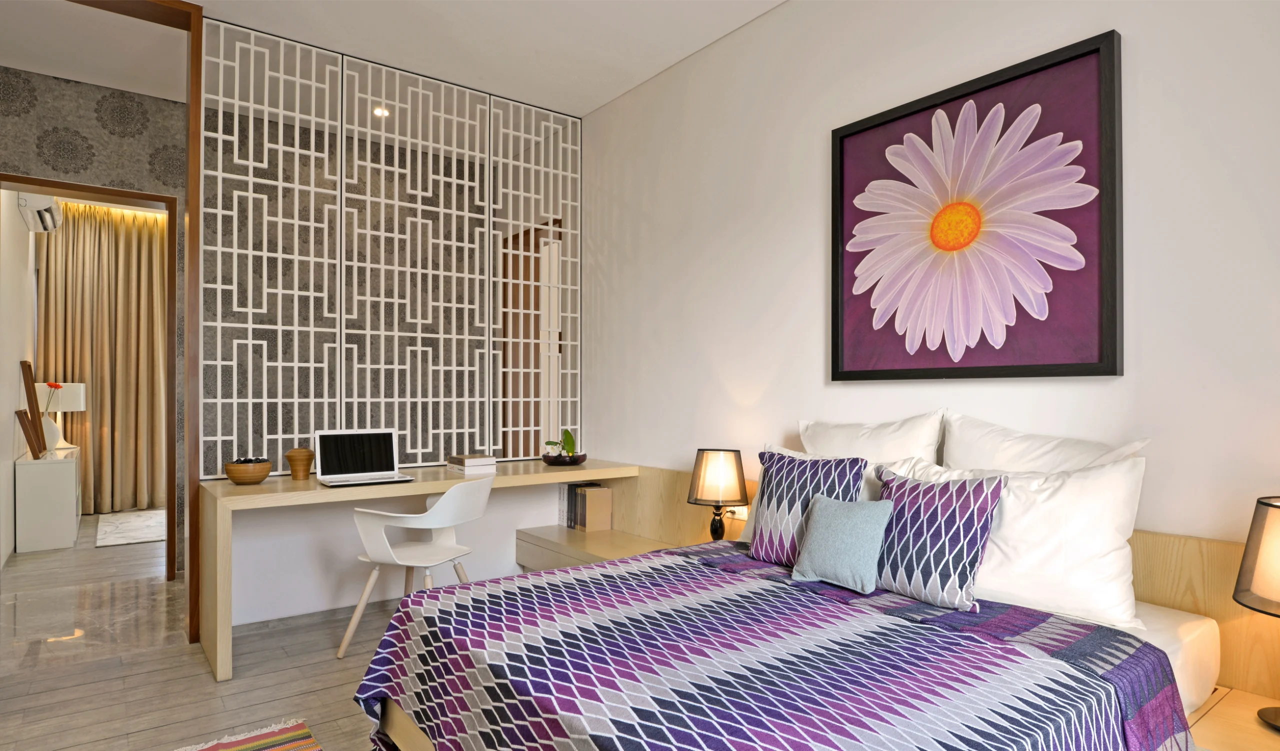 The common zones—living room, dining area, and corridor—acted as spatial connectors, brought together by consistent design gestures. A defining feature here is the bespoke screen near the dining area, serving both as a visual anchor and a semi-transparent spatial divider that lends depth and rhythm to the open-plan layout.