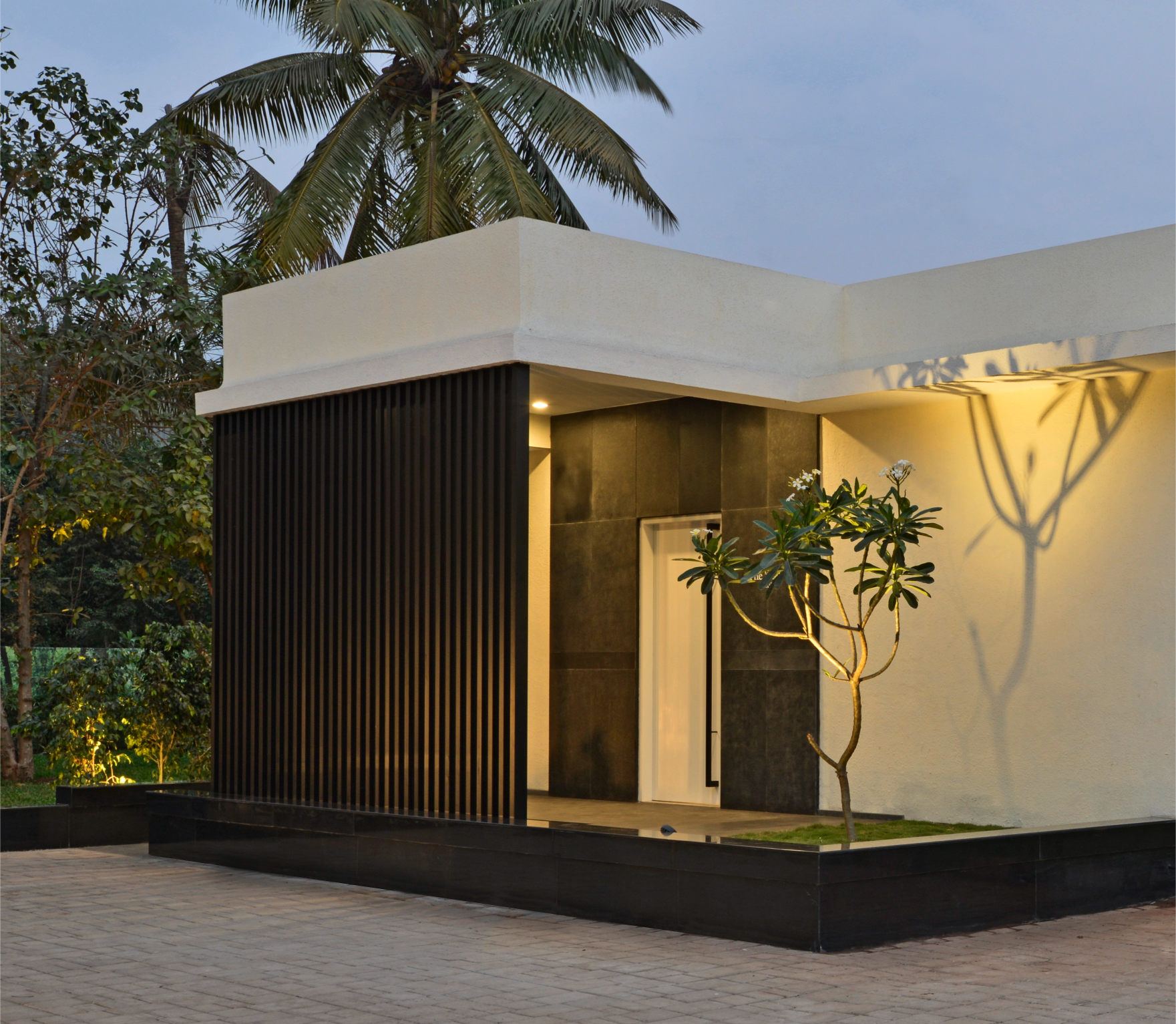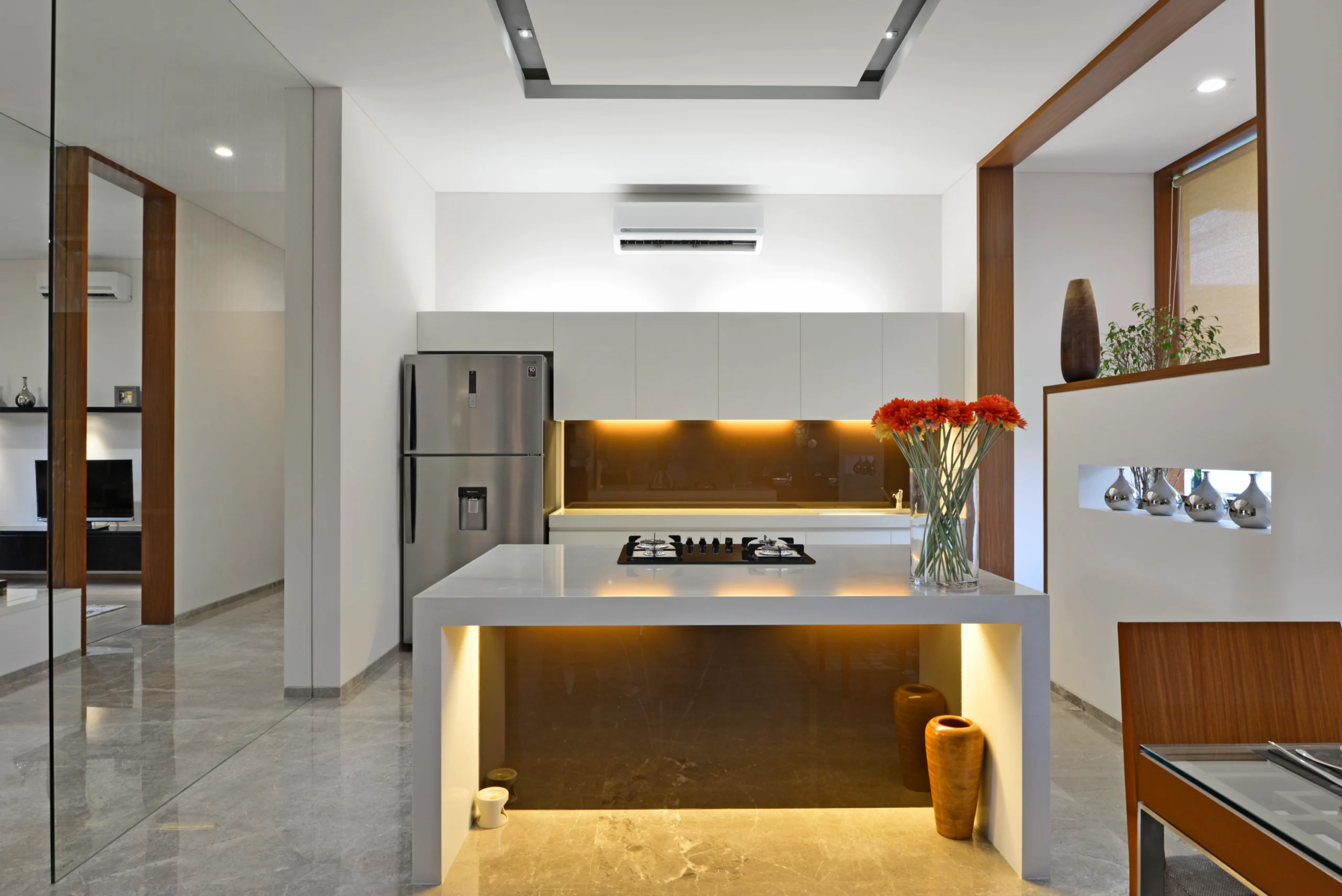 Before even entering the apartment, a serene landscaped arrival experience sets the tone—lush, calming, and suggestive of retreat. This garden-like foreground was created to subtly lower the sensory tempo, allowing visitors to feel immediately at ease before being introduced to the home’s interiors.
